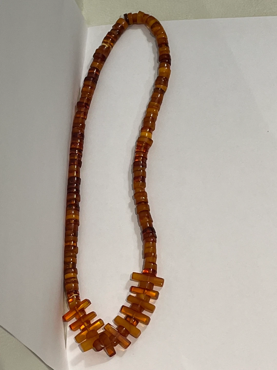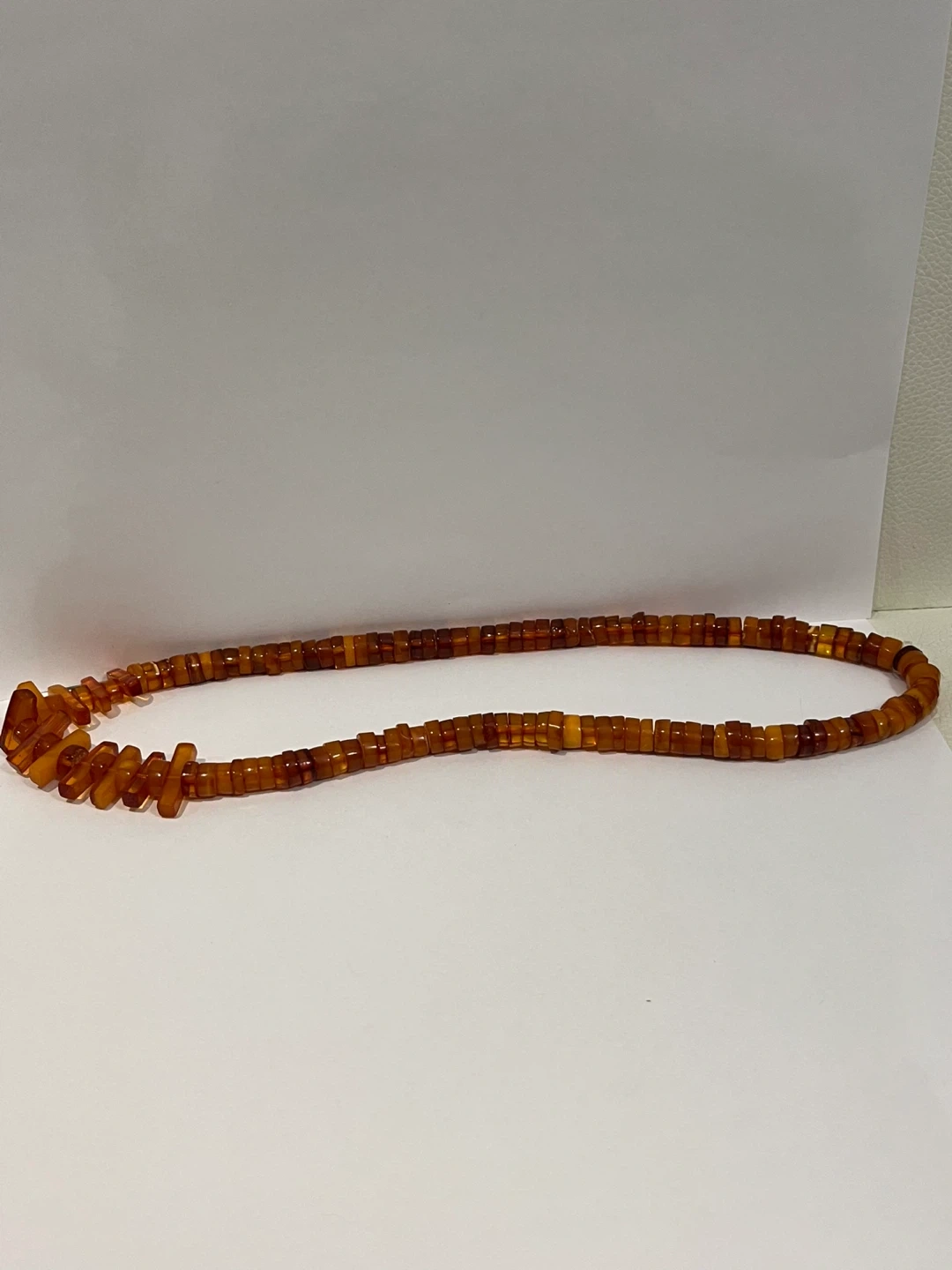 Selling a beautiful amber beaded necklace. It's in great condition and has a lovely warm colour. Perfect for adding a touch of elegance to any outfit!