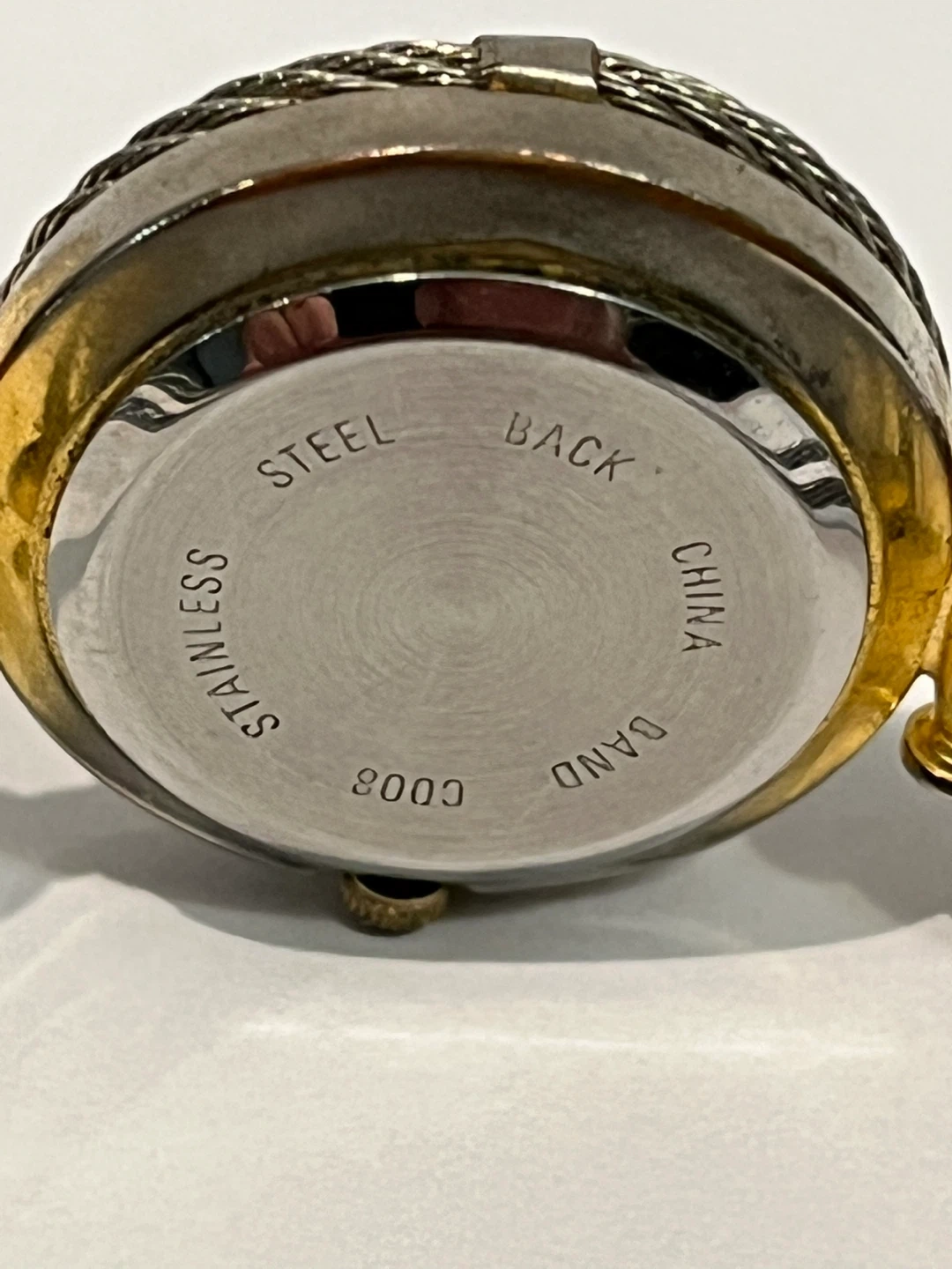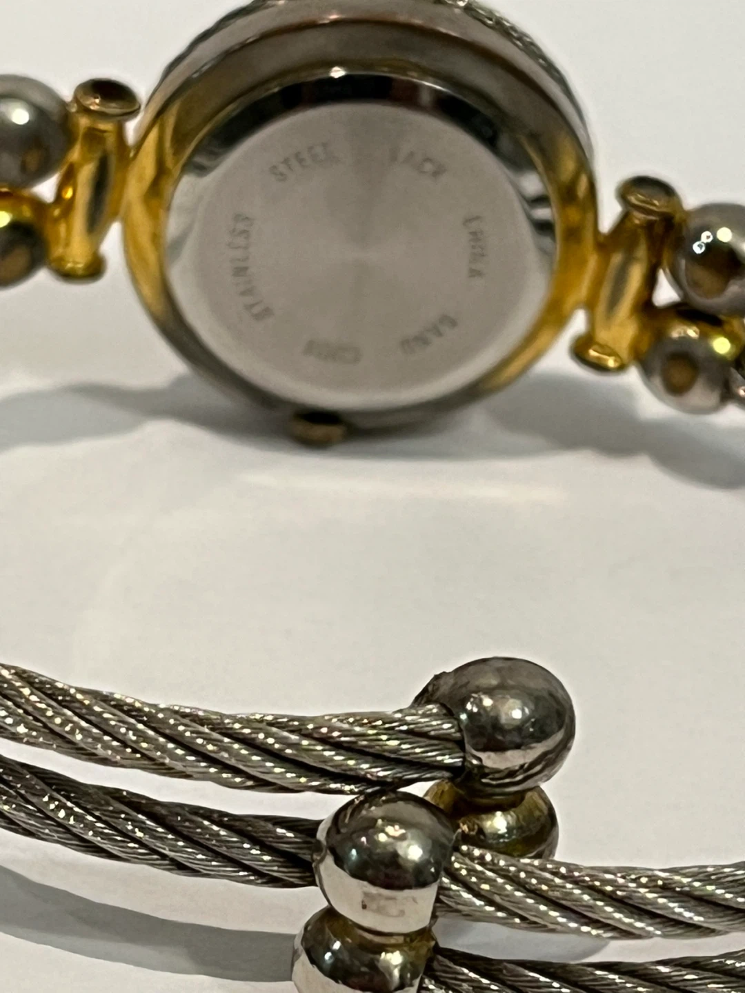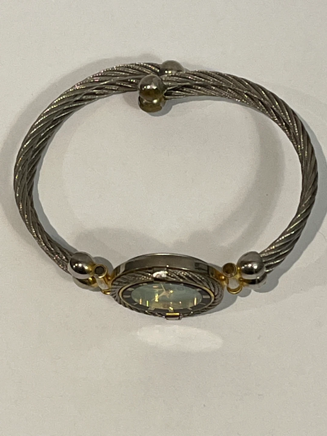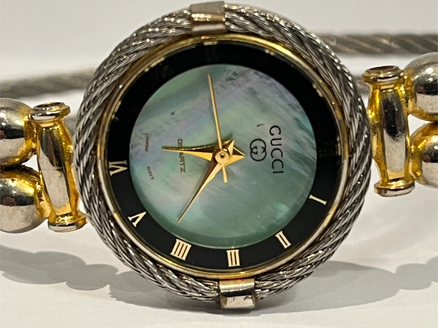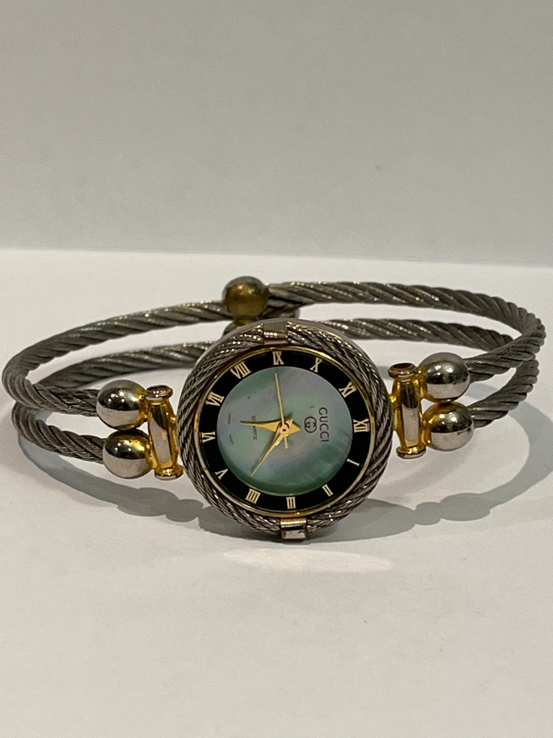 Selling a Gucci ladies' bangle watch. It has a stainless steel back and a unique cable-style bangle. The dial features Roman numerals. It's in good condition and ready for a new home!