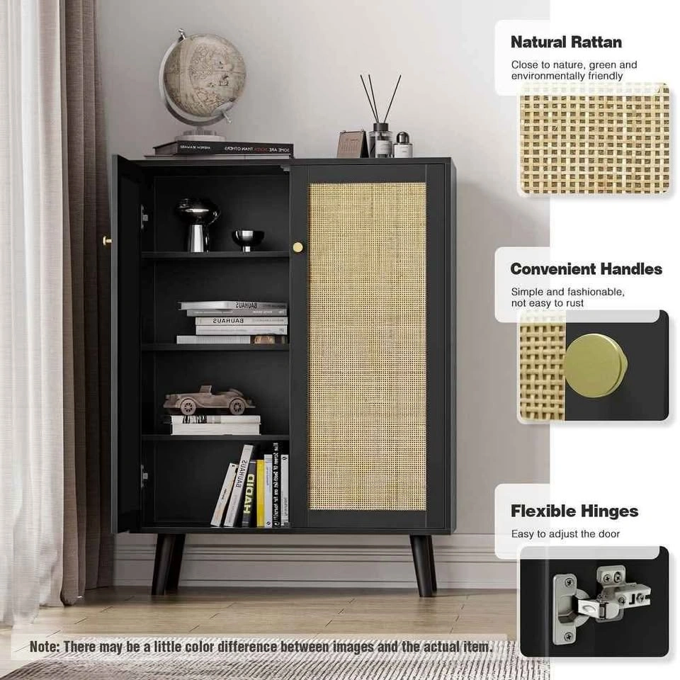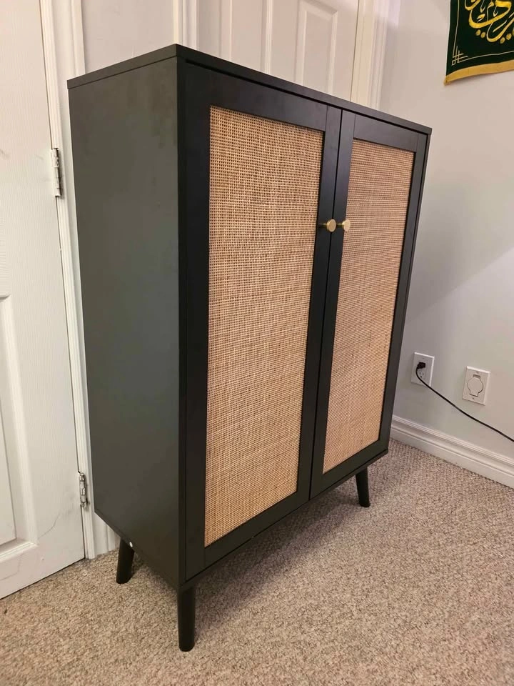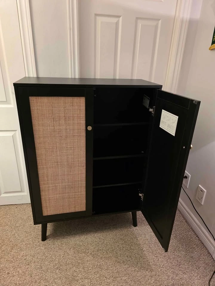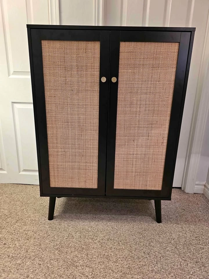 Stylish and functional cabinet with a black finish and natural rattan doors. Features adjustable shelves, gold-tone knobs, and sturdy legs for a modern yet timeless look. Perfect as an accent cabinet, sideboard, or storage solution for living rooms, bedrooms, or entryways. Brand new from a liquidation pallet. Fully assembled, and ready for pickup. Dimensions: 31.5”W x 13.4”D x 44”H