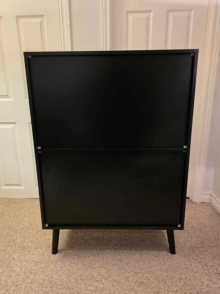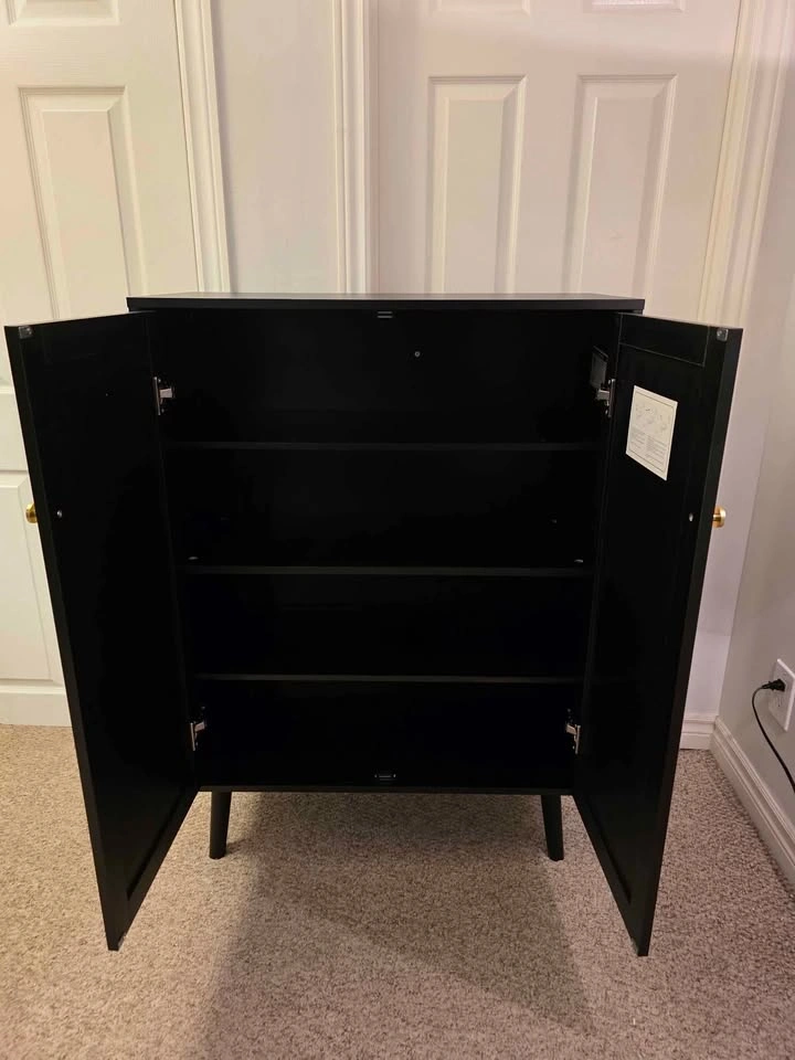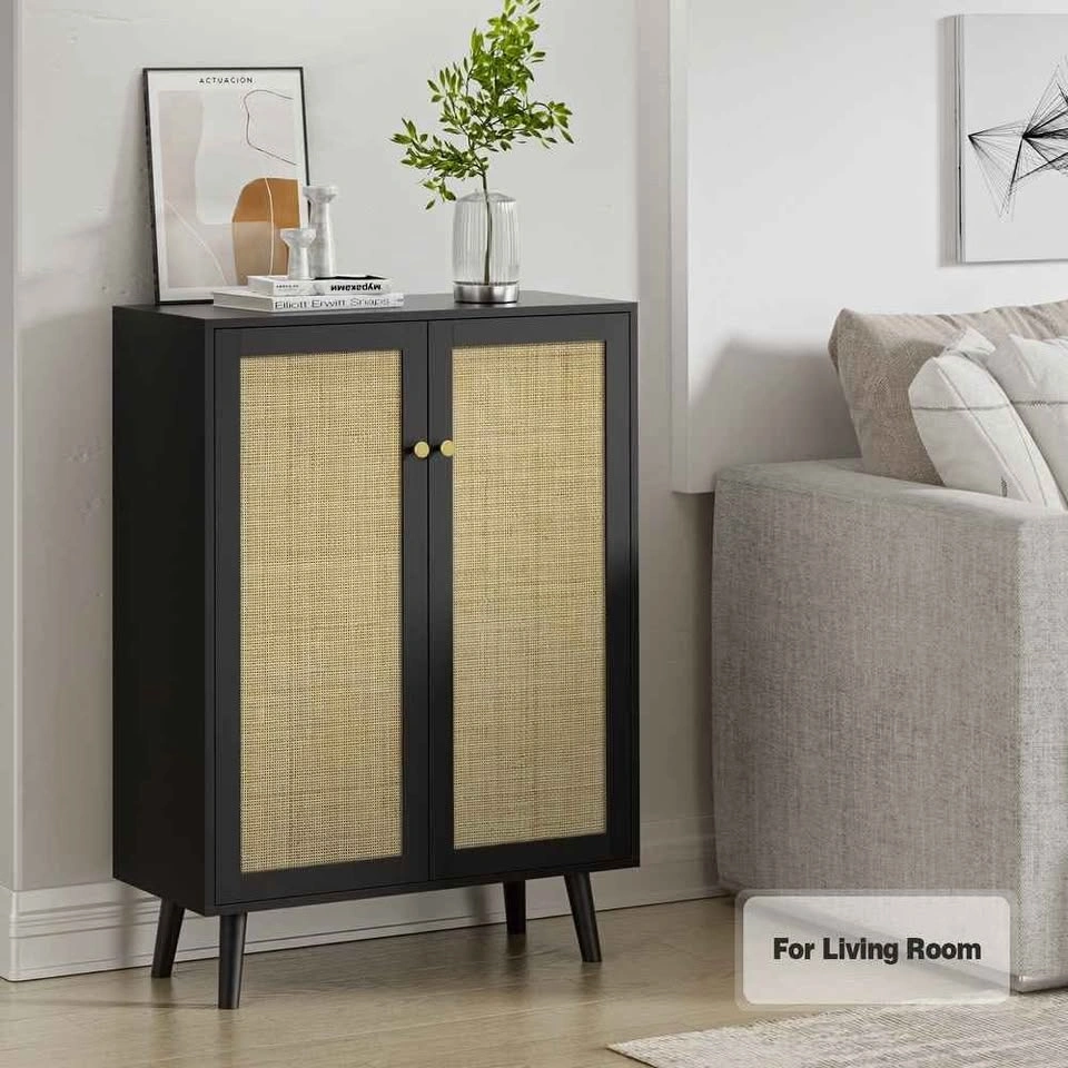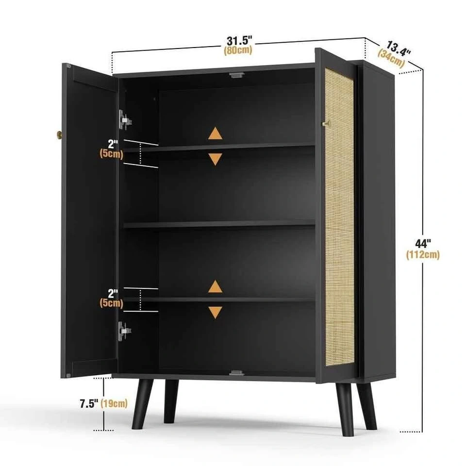 Stylish and functional cabinet with a black finish and natural rattan doors. Features adjustable shelves, gold-tone knobs, and sturdy legs for a modern yet timeless look. Perfect as an accent cabinet, sideboard, or storage solution for living rooms, bedrooms, or entryways. Brand new from a liquidation pallet. Fully assembled, and ready for pickup. Dimensions: 31.5”W x 13.4”D x 44”H