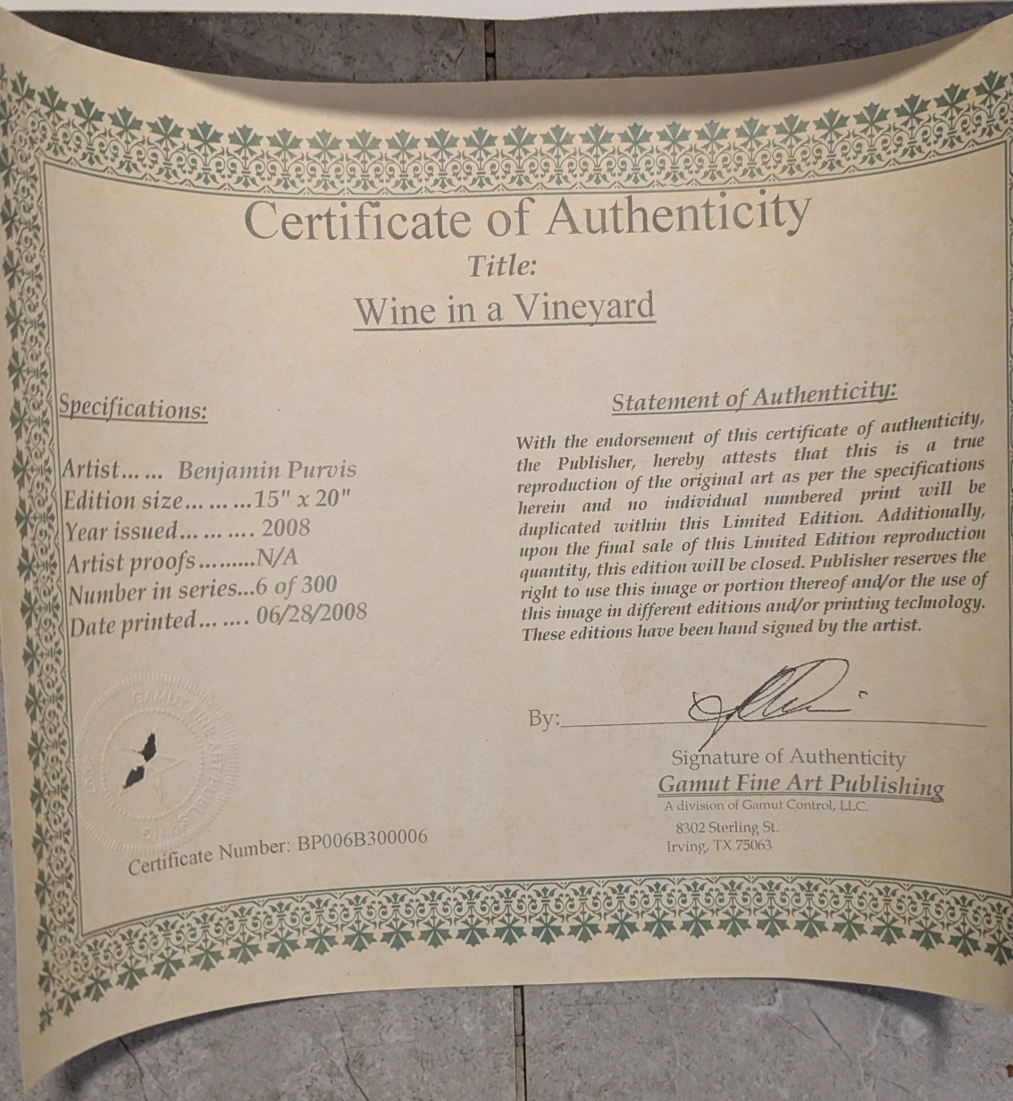 Selling a lovely print titled "Wine in a Vineyard" by the artist Benjamin Purvis. The edition size is 15" x 20", and it was issued in 2008. This is number 6 of a series of 300. The date printed is June 28, 2008. It comes with a certificate of authenticity signed by the artist!