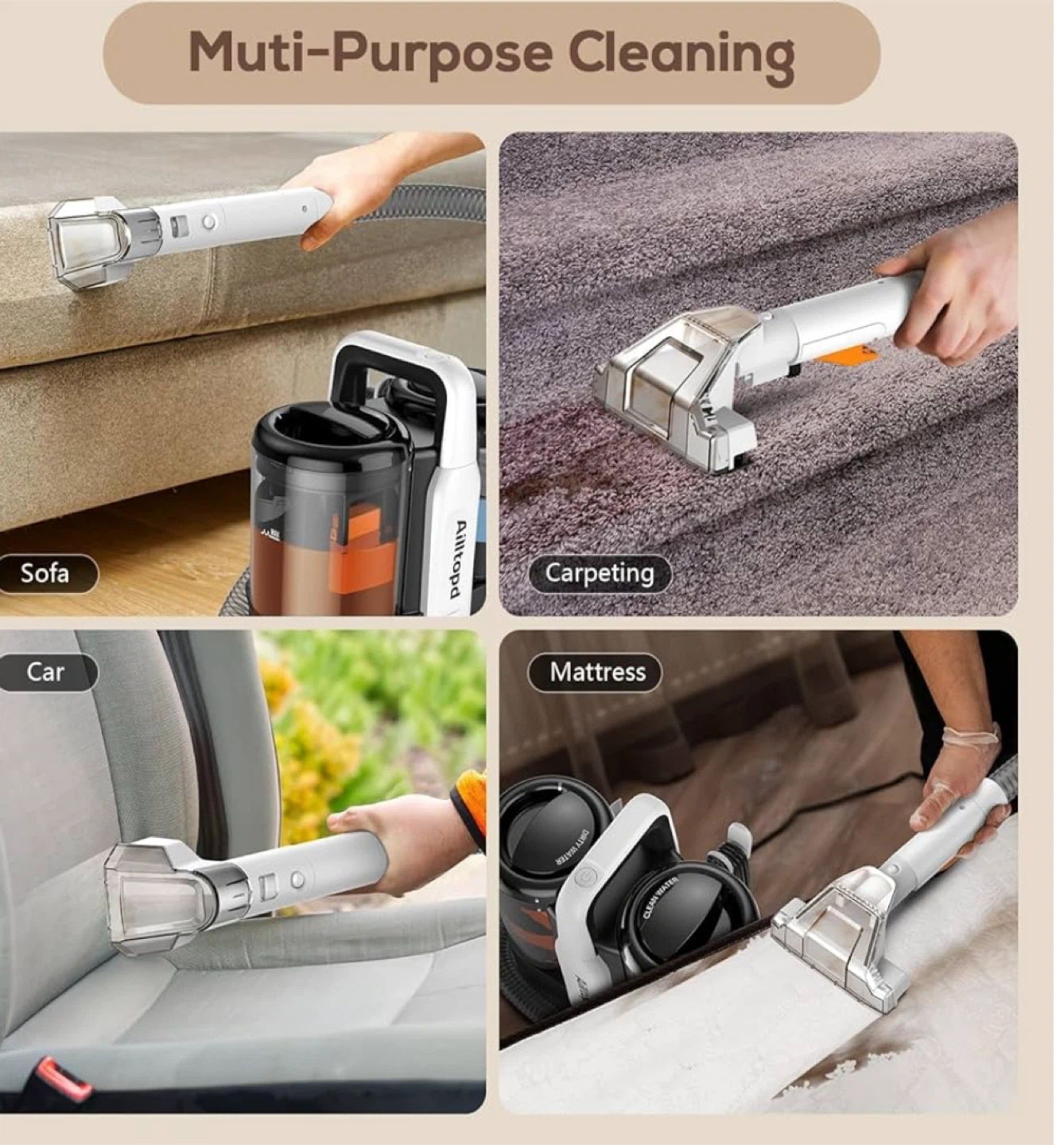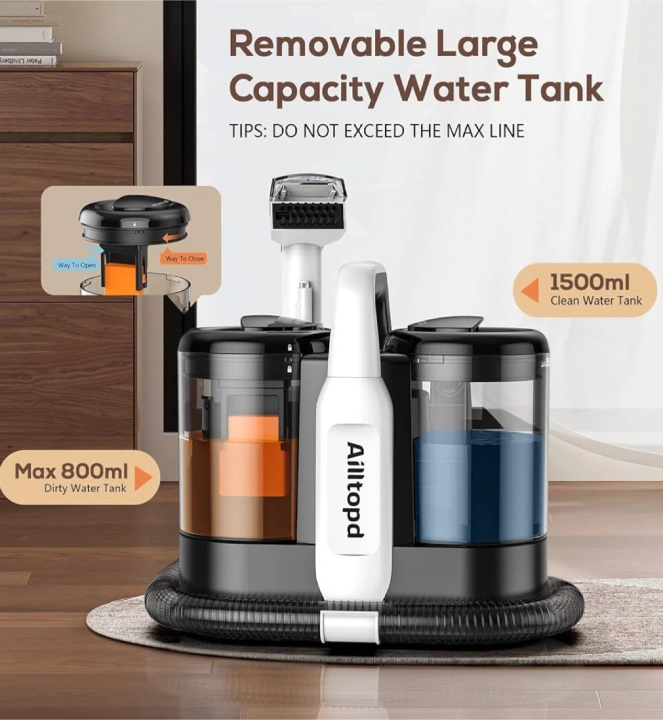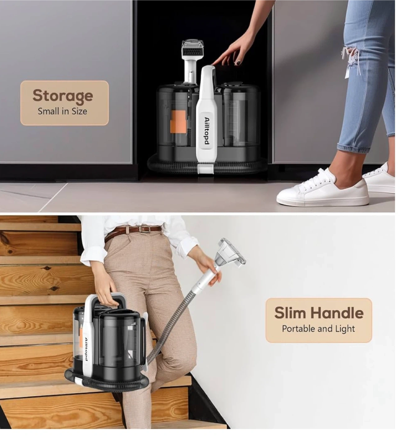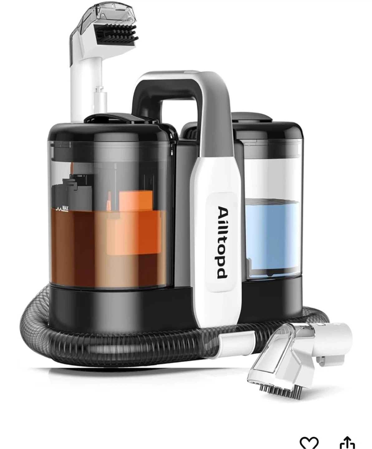Selling an Ailltopd portable carpet and upholstery cleaner. It features a removable large capacity water tank and has an all-in-one function for spraying, brushing, and suction. The cleaner also has a detachable self-cleaning hose tool.