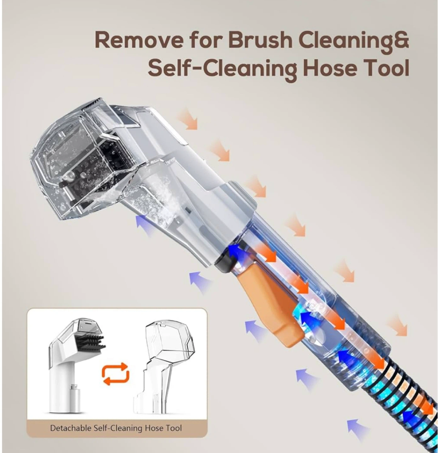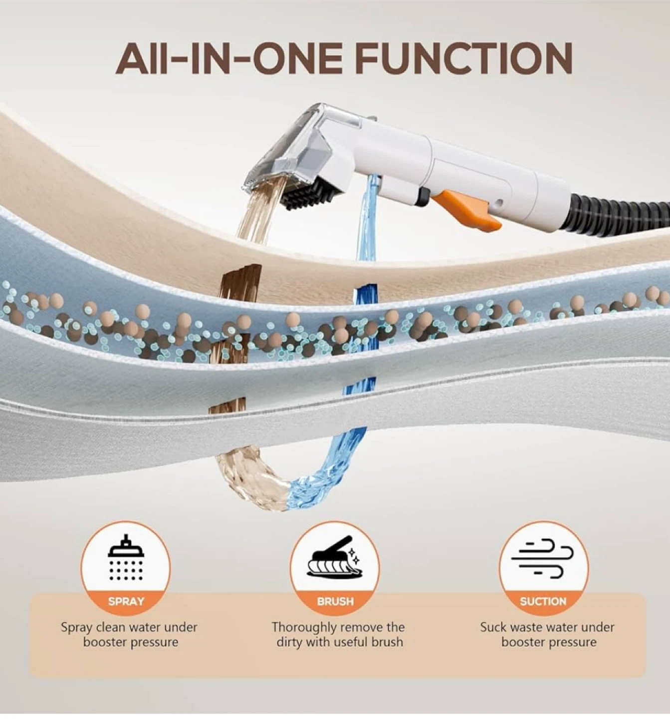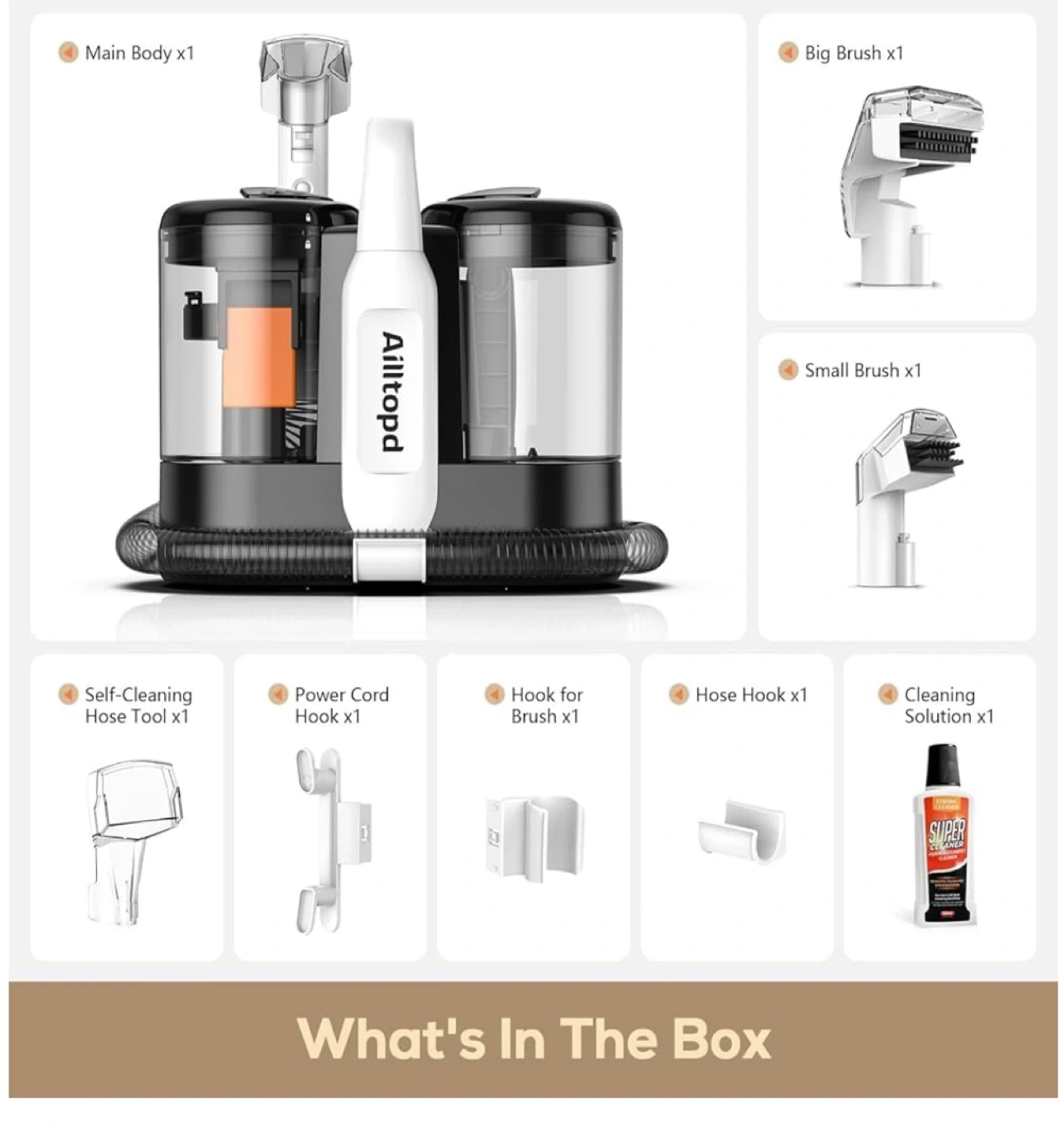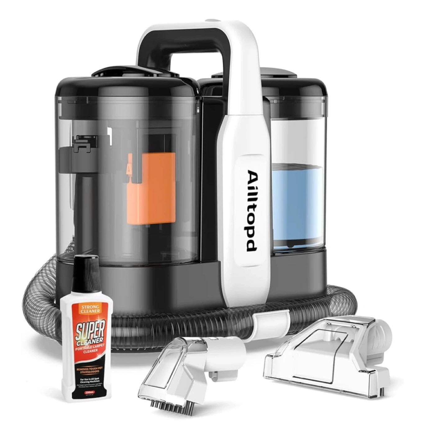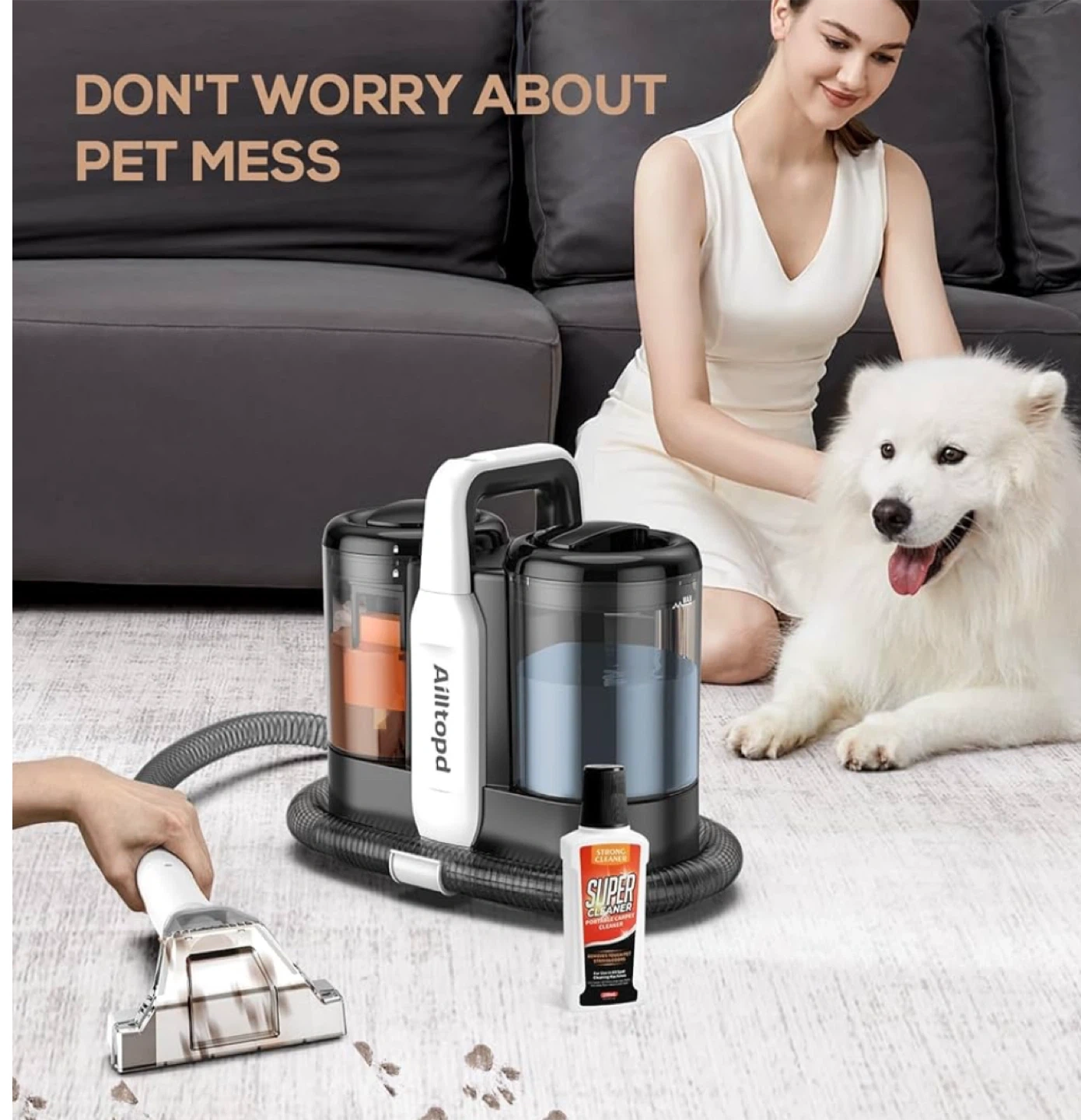 Selling an Ailltopd portable carpet and upholstery cleaner. It features a removable large capacity water tank and has an all-in-one function for spraying, brushing, and suction. The cleaner also has a detachable self-cleaning hose tool.