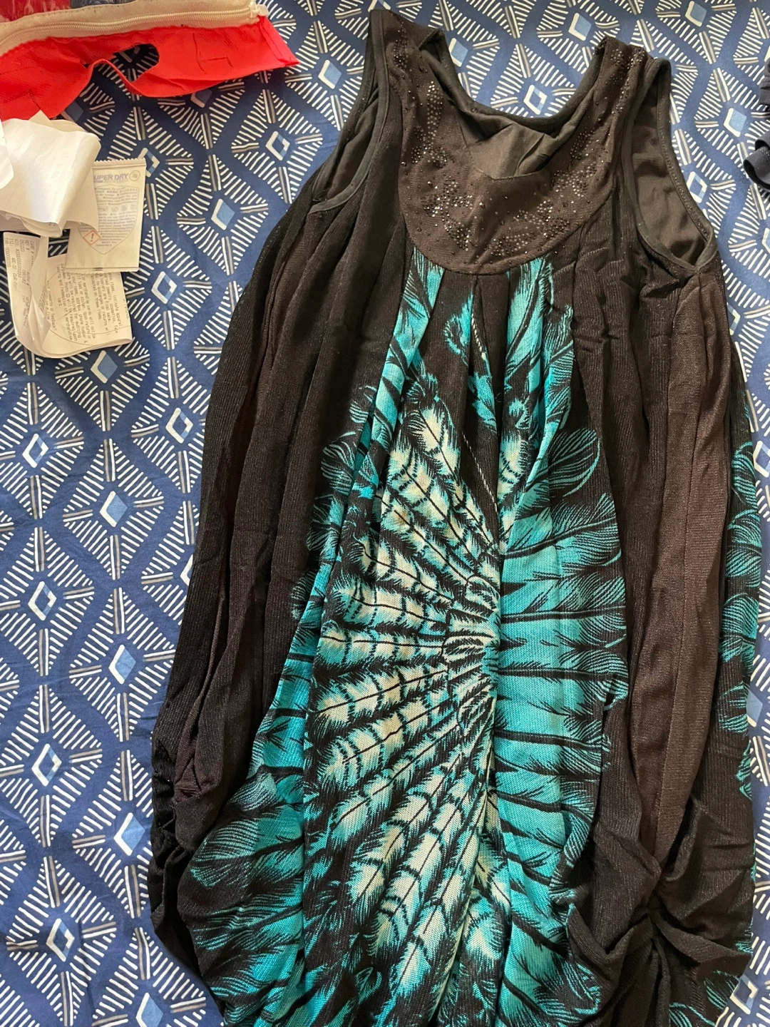 Cute sleeveless dress with a feather print design! It's black with a bright turquoise feather graphic on the front. Perfect for summer days or layering in the fall