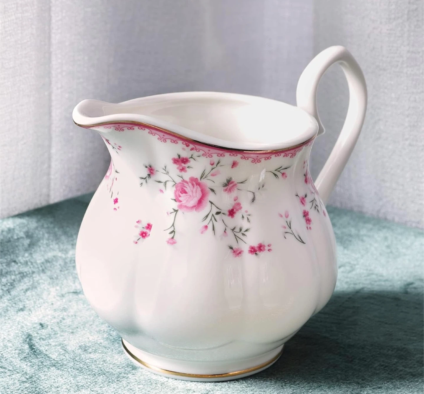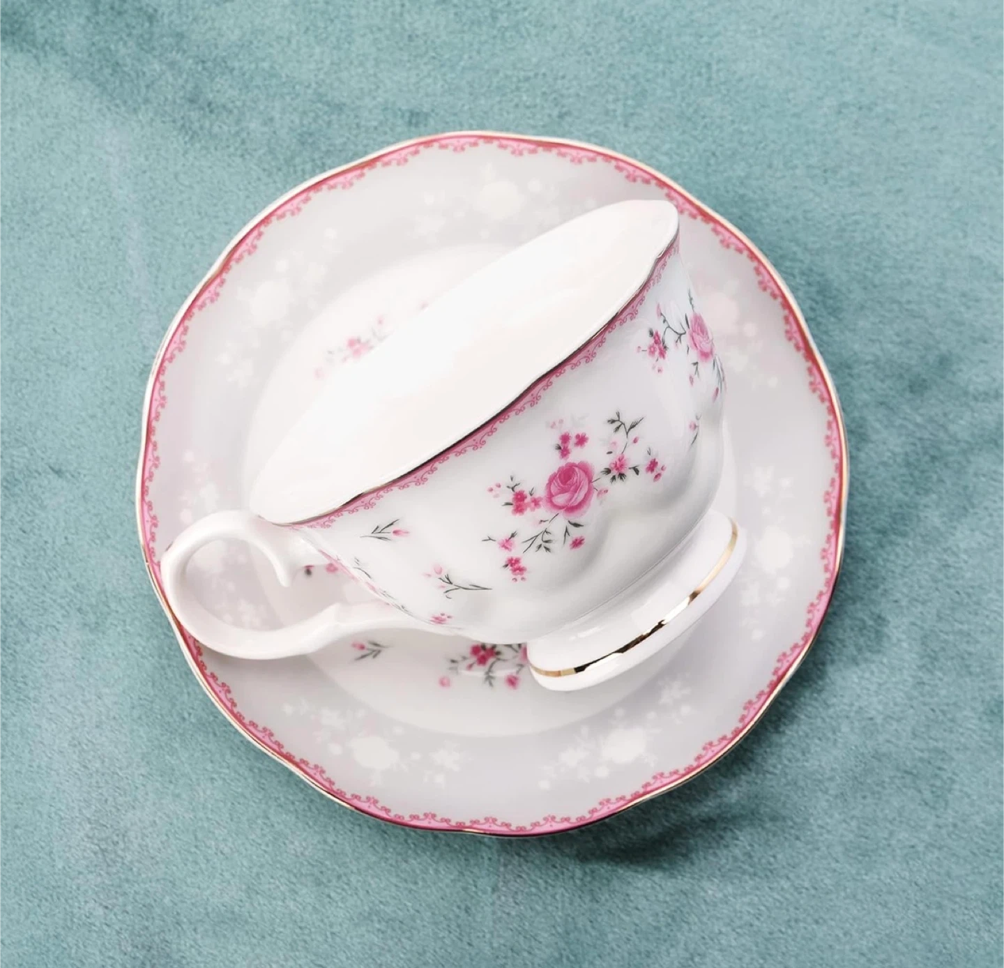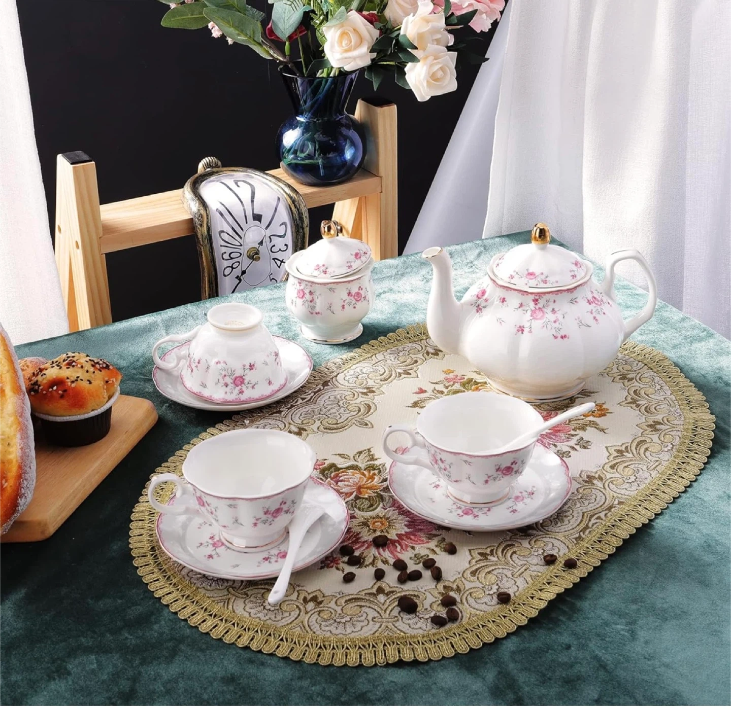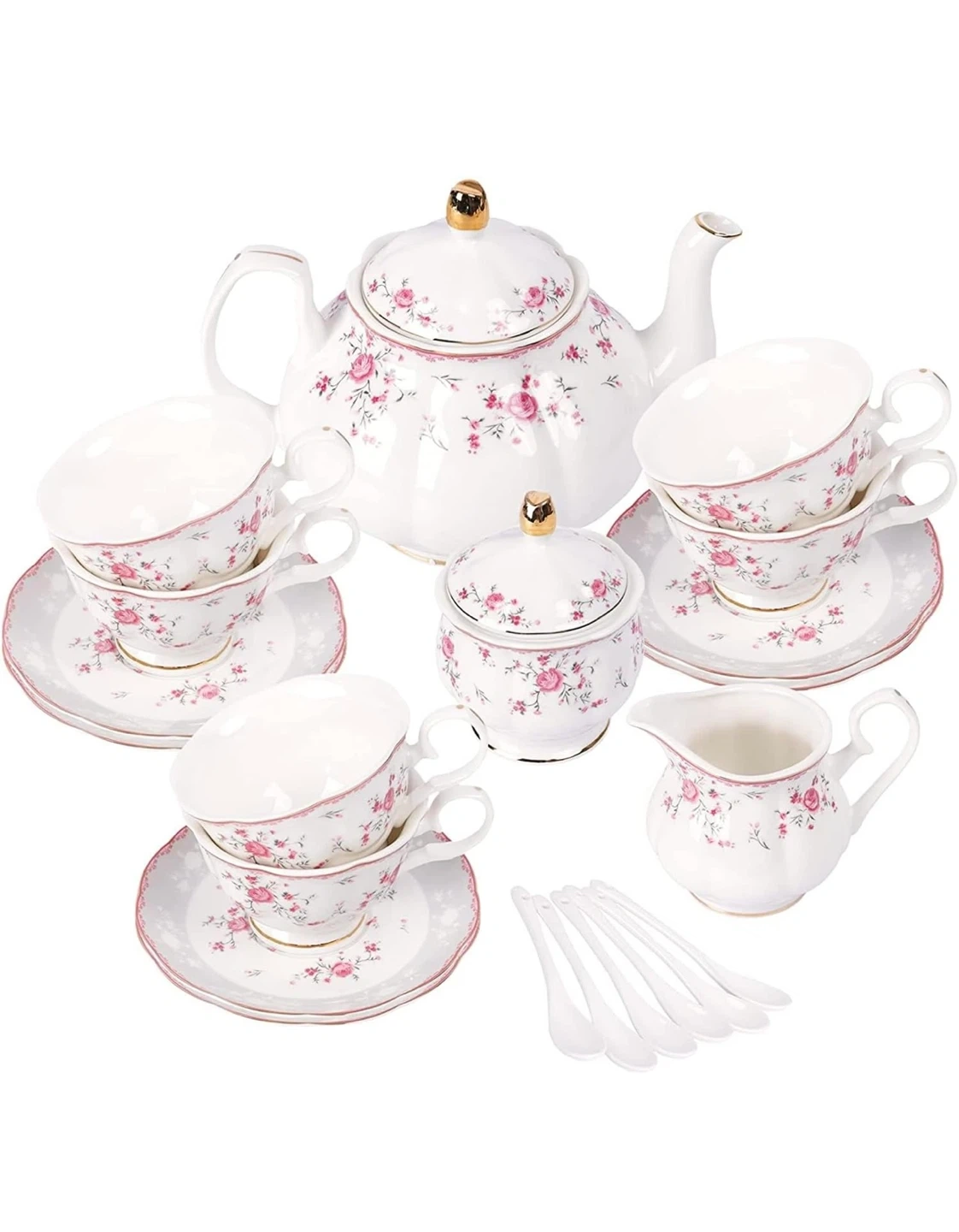 Here is a beautiful floral tea set! It includes a teapot, creamer, sugar bowl, six cups, six saucers, and six spoons Used once only. Comes in original box and packing
