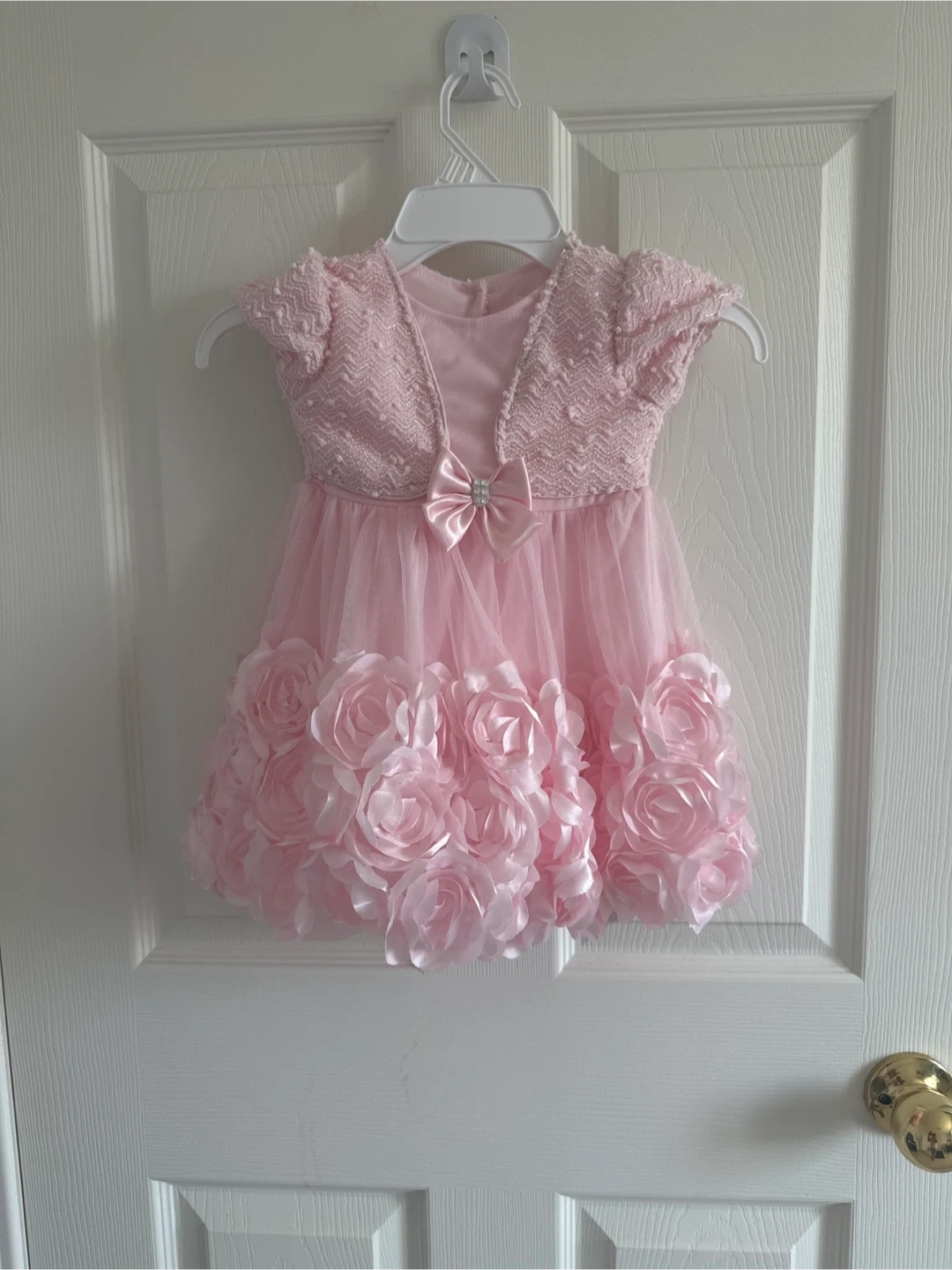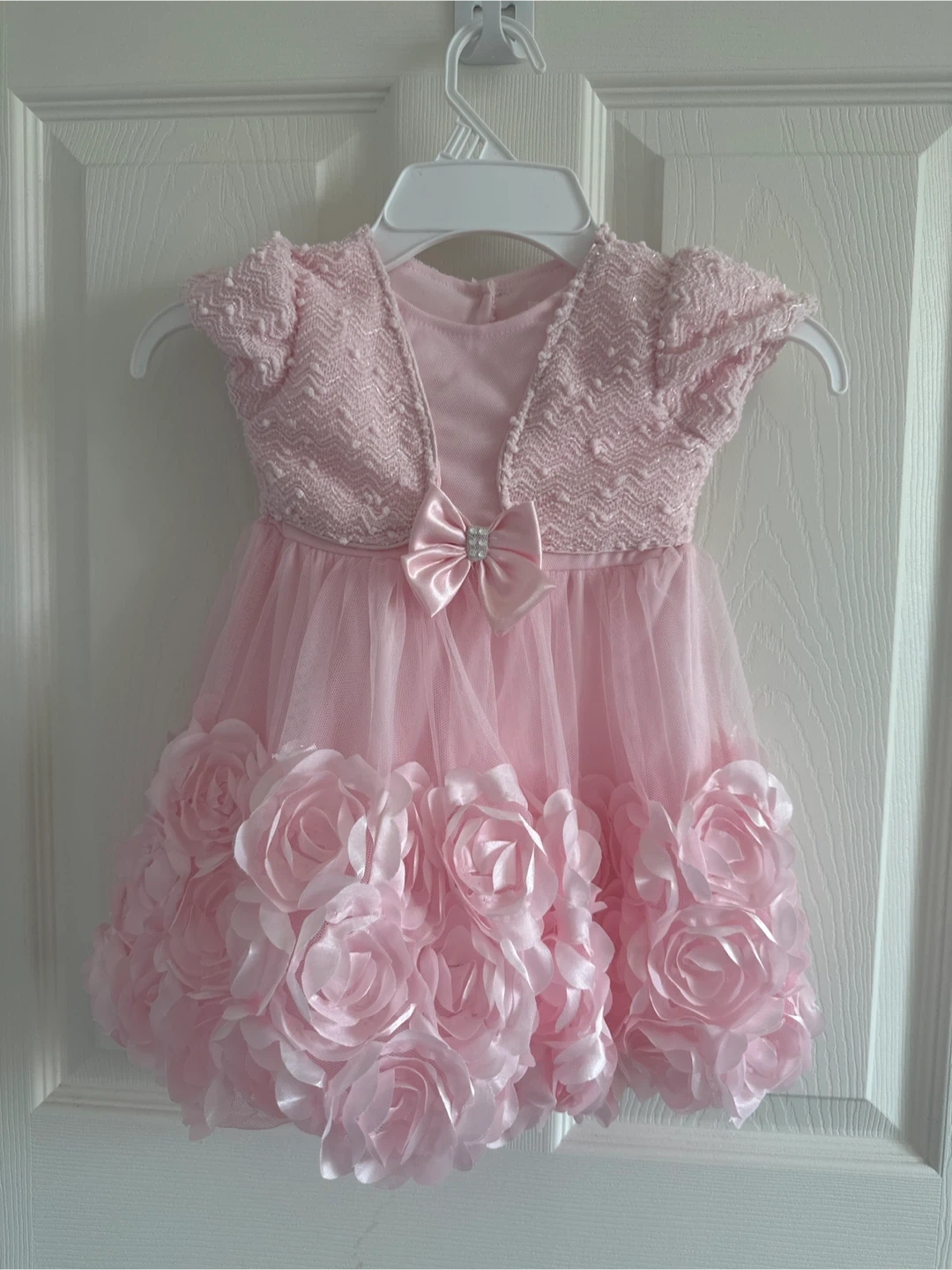 A beautiful pink baby dress featuring a delicate rose design! This adorable dress is perfect for special occasions or just looking extra cute. It's in great condition and ready for a new little owner