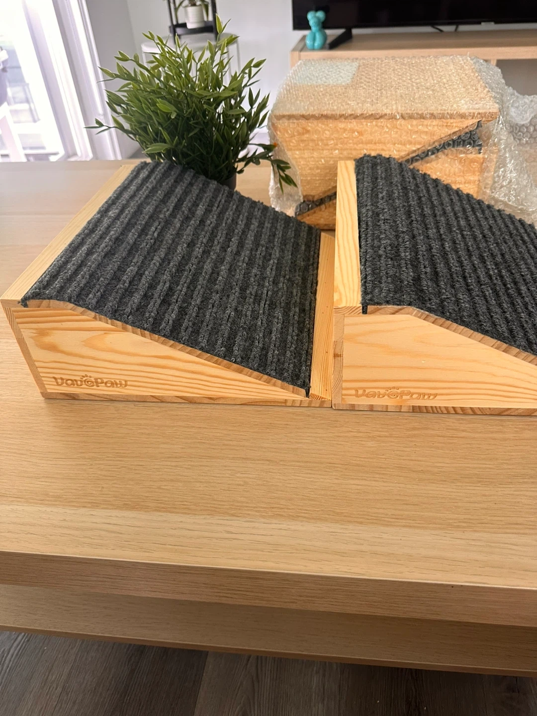 Selling a set of VavoPaw dog ramp steps. These are great for helping your furry friend reach higher places like beds or couches. They're made with a sturdy wooden frame and a comfortable carpeted surface. Perfect for small to medium-sized dogs!