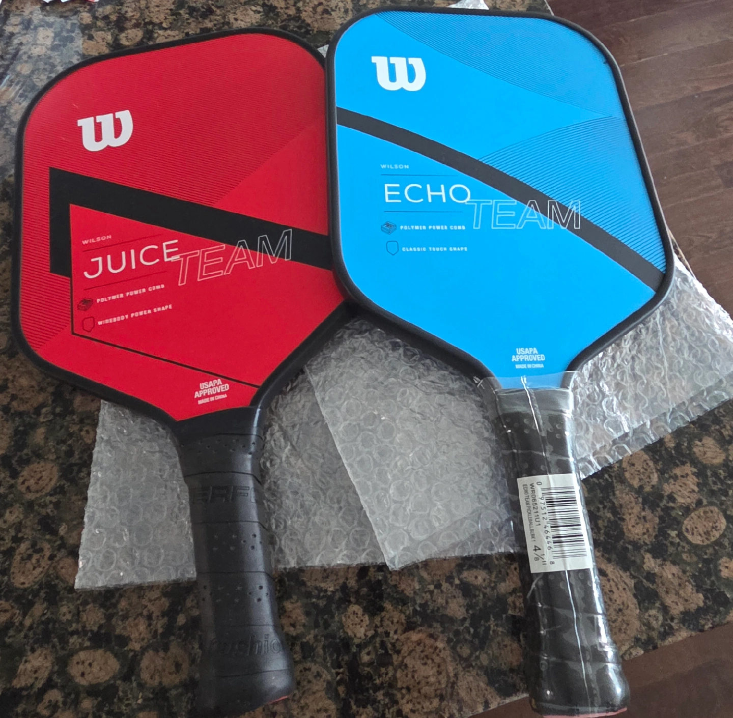 Selling a set of Wilson pickleball paddles! One is the Juice Team in red, and the other is the Echo Team in blue. Both feature a polymer power comb and a widebody shape for great performance on the court. The Echo Team also boasts a classic touch shape. They are USAPA approved and ready for your next game! $90 for both or $50 each