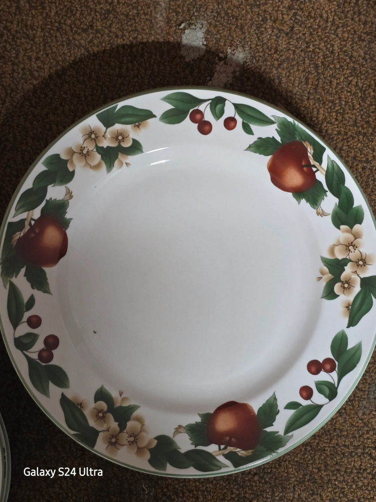 Selling a set of vintage Mikasa 'Whole Wheat' dinnerware. This set features a charming design with fruits and flowers, perfect for adding a touch of elegance to your dining table. The plates and bowls are in good condition and ready for a new home 6 large, 5 med and 5 small plates