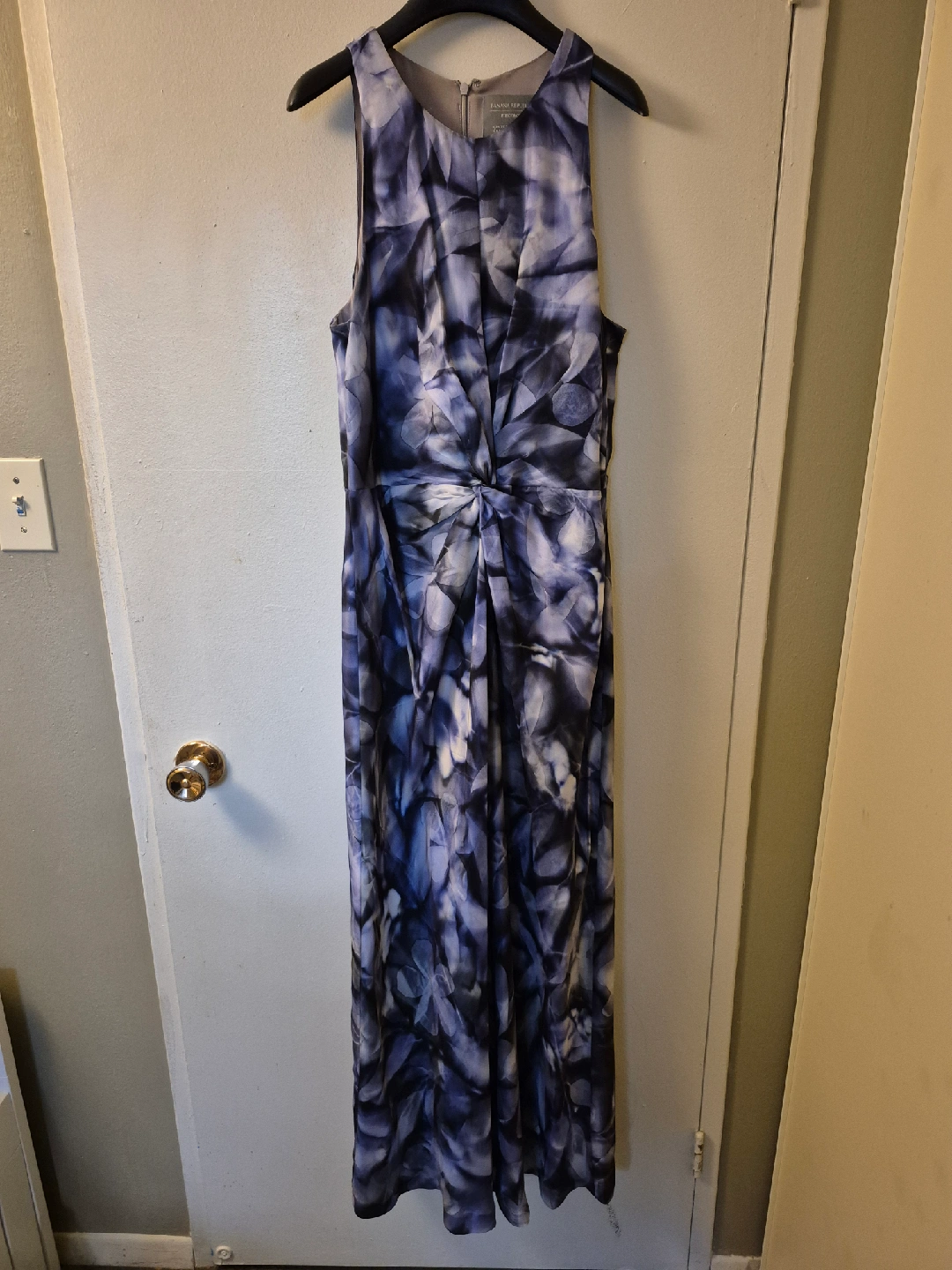 This is a beautiful Banana Republic sleeveless maxi dress. It features a unique blue/purple and white pattern. The dress is a size 8, the shell is 100% silk, has a keyhole feature and twist detail on the frontnof the dress. Perfect for a special occasion! Only worn once, no longer fits Pet and smoke free home.