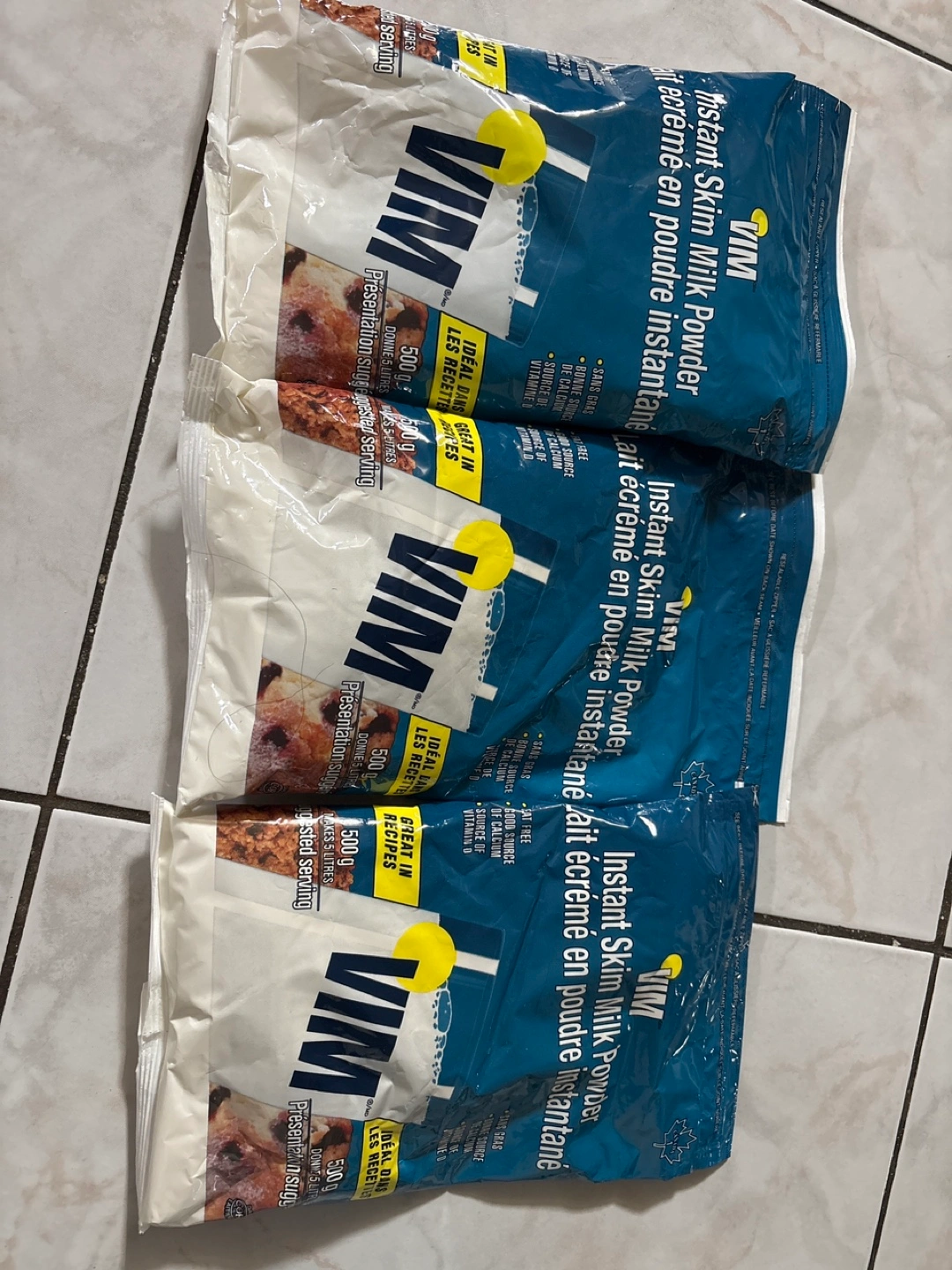 Selling three bags of VIM Instant Skim Milk Powder. Each bag contains 500g of milk powder, perfect for adding to your favourite recipes or enjoying as a nutritious drink. It's a good source of calcium and vitamin D, and it's fat-free