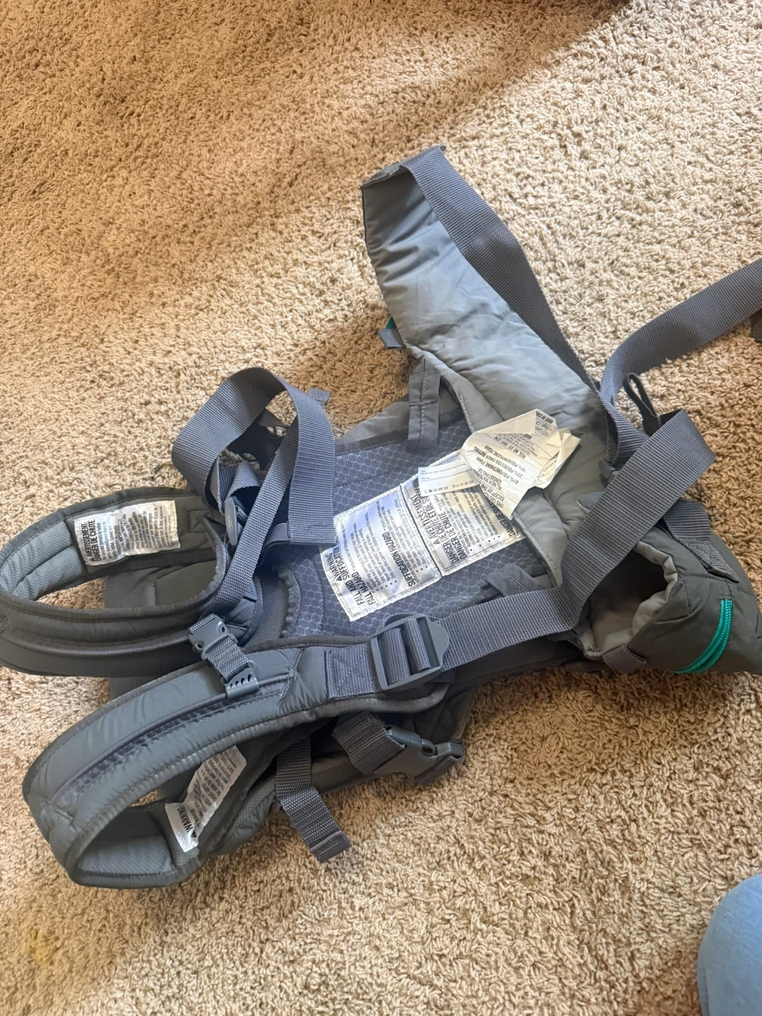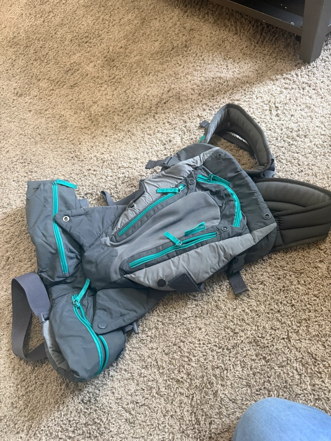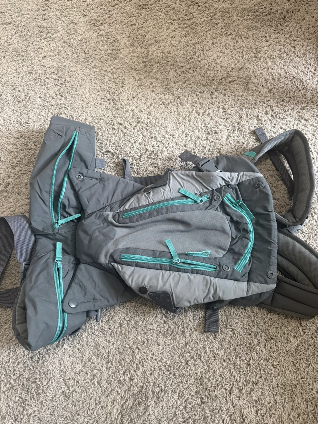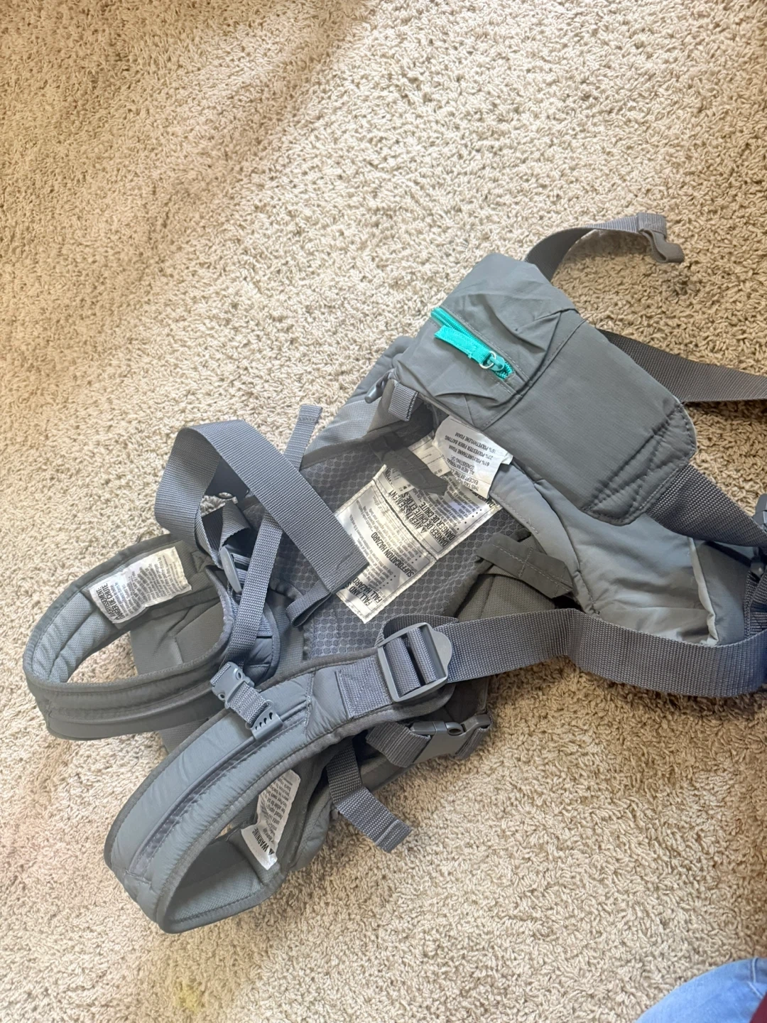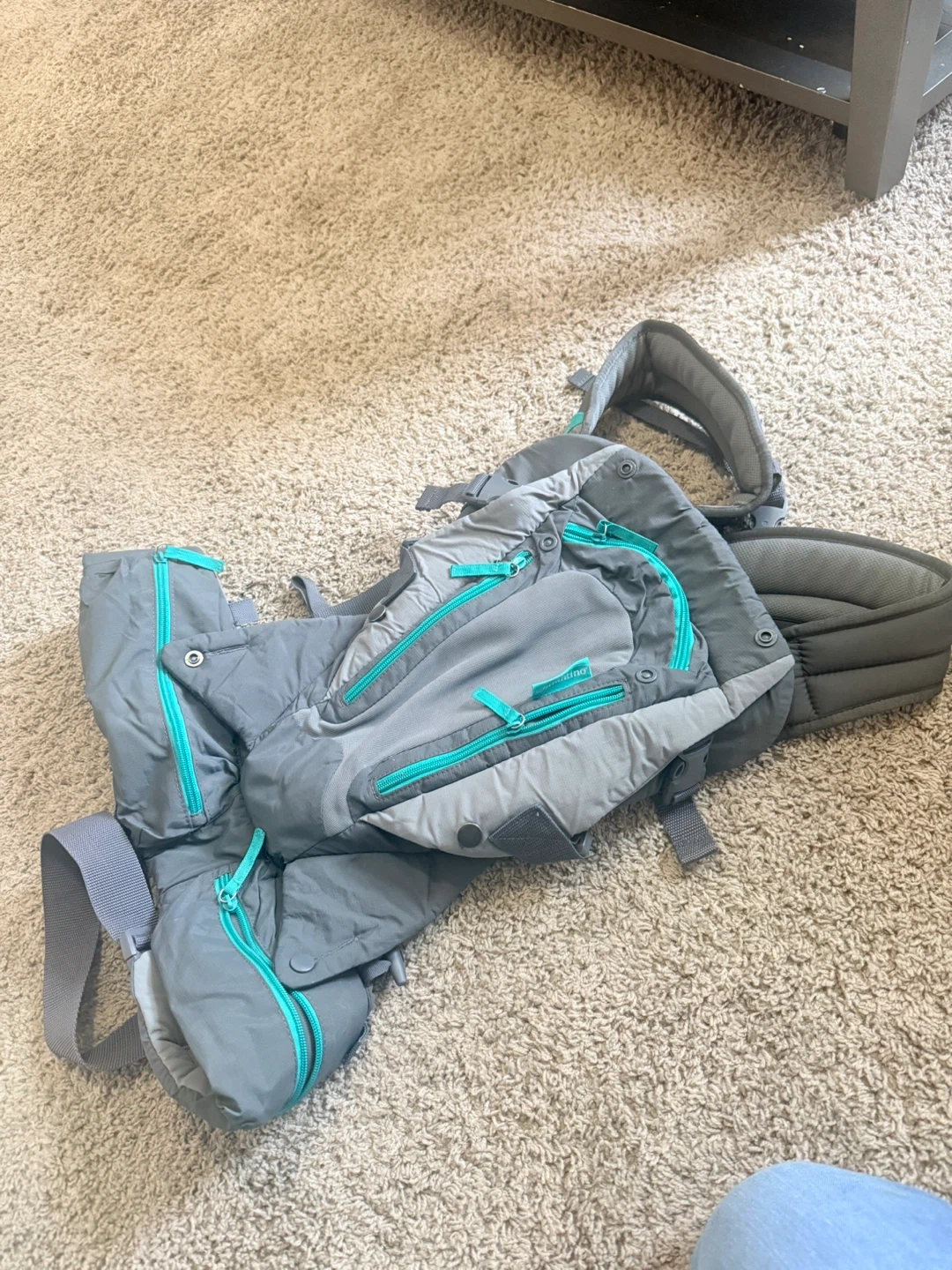 Infantino baby carrier in great condition! It's a stylish grey colour with teal accents. Perfect for keeping your little one close and comfortable while you're on the go. It’s brand new. Barely used
