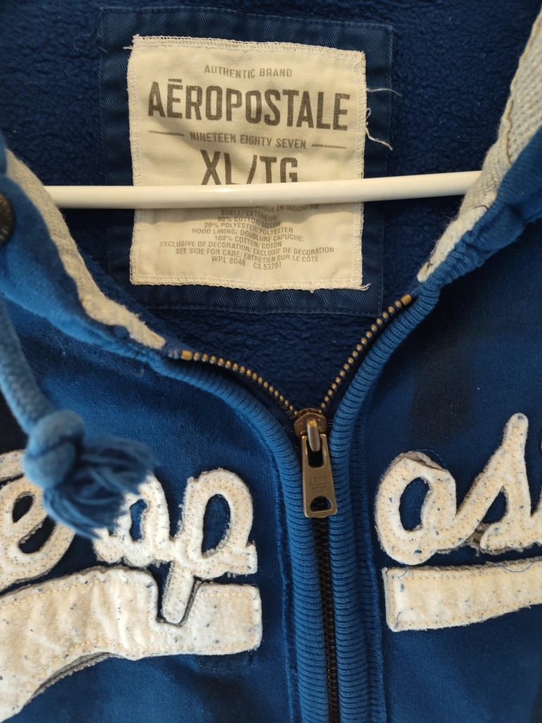 Selling a blue Aeropostale zip-up hoodie in size XL. It's in excellent condition and ready for a new home! The hoodie is made of 80% cotton and 20% polyester, making it super comfy. It has a full zip and a hood, perfect for layering. cash only p/u Streetsville
