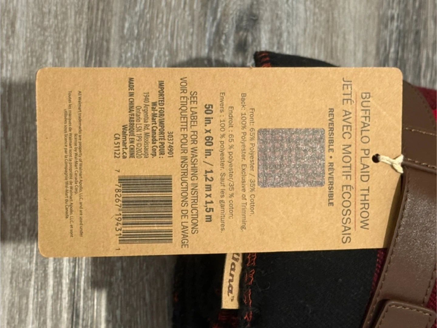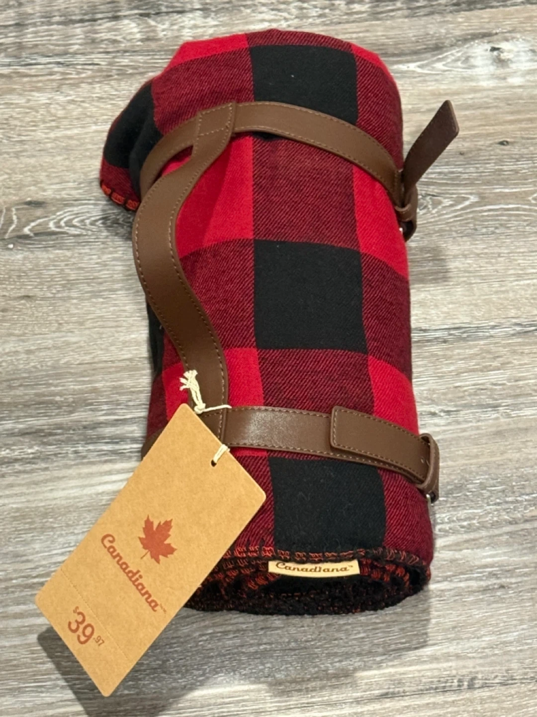 Snuggle up with this Canadiana Buffalo Plaid Throw! It's reversible with a classic red and black pattern. It measures 50 in x 60 in / 1.2 m x 1.5 m. The front is made of 65% polyester and 35% cotton, while the back is 100% polyester. It was originally bought for $39.97 Pick up Sage Hill Cash only Smoke and pet free home Check out my other items