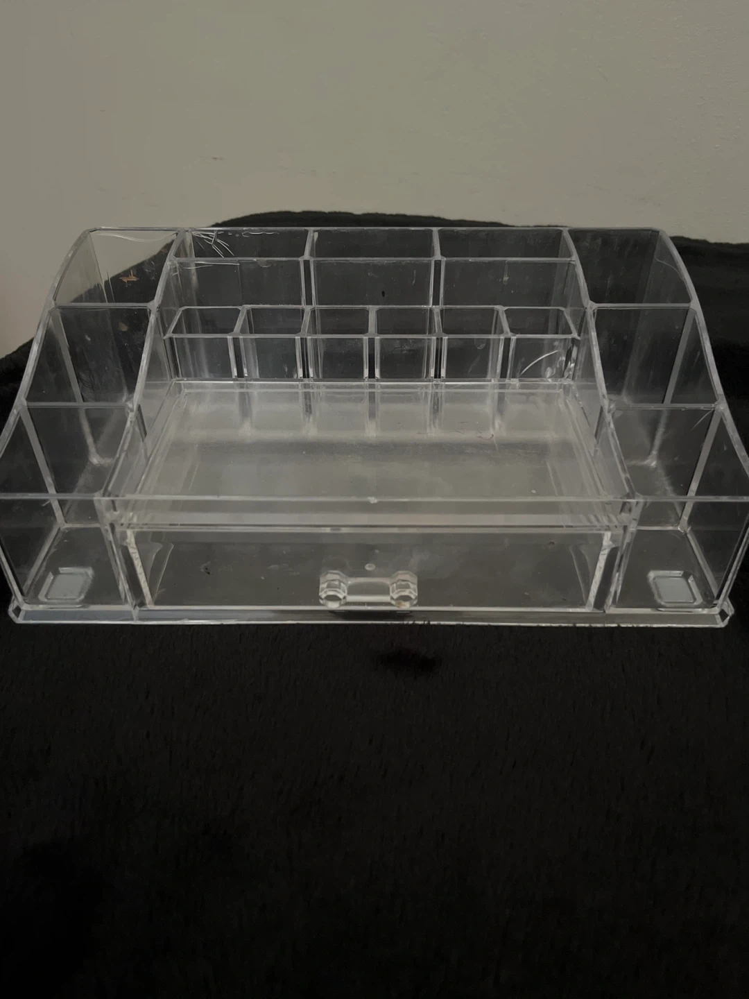 Selling a clear acrylic makeup organizer with multiple compartments and a drawer. It's perfect for keeping all your cosmetics neat and tidy. There is a small crack on the top, as shown in the photos.