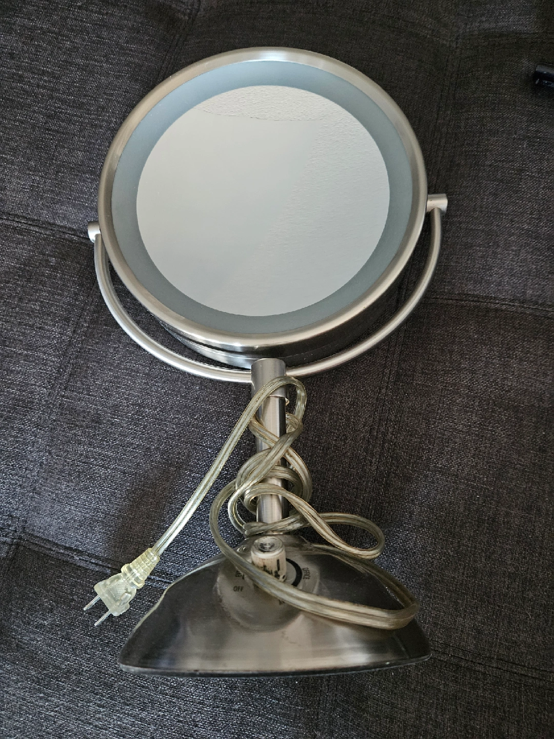 Conair lighted makeup mirror. Model BE103CTXC. It has settings for Evening, Home, Day, and Office lighting on both sides. Perfect for getting your makeup just right with 1 side regular view and the other an extreme zoom view for close-up reflection. Approx 15" tall, 9" wide. Gently used. No batteries required. Located King St W and Dufferin St. See my other listings.