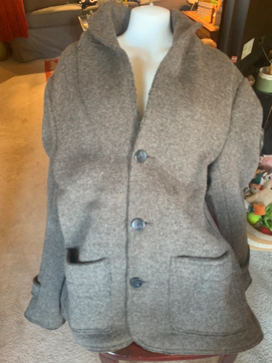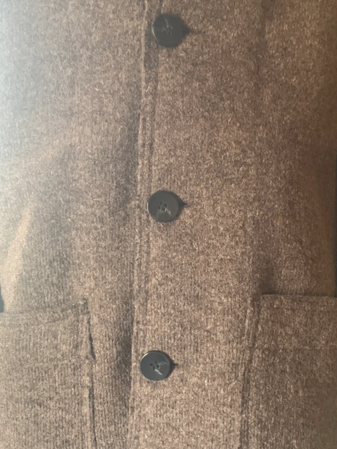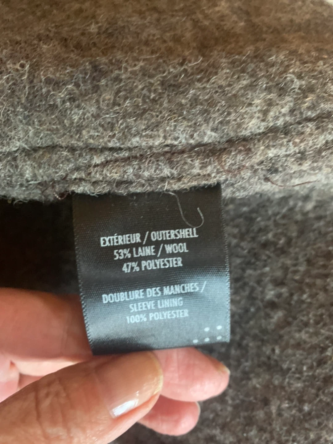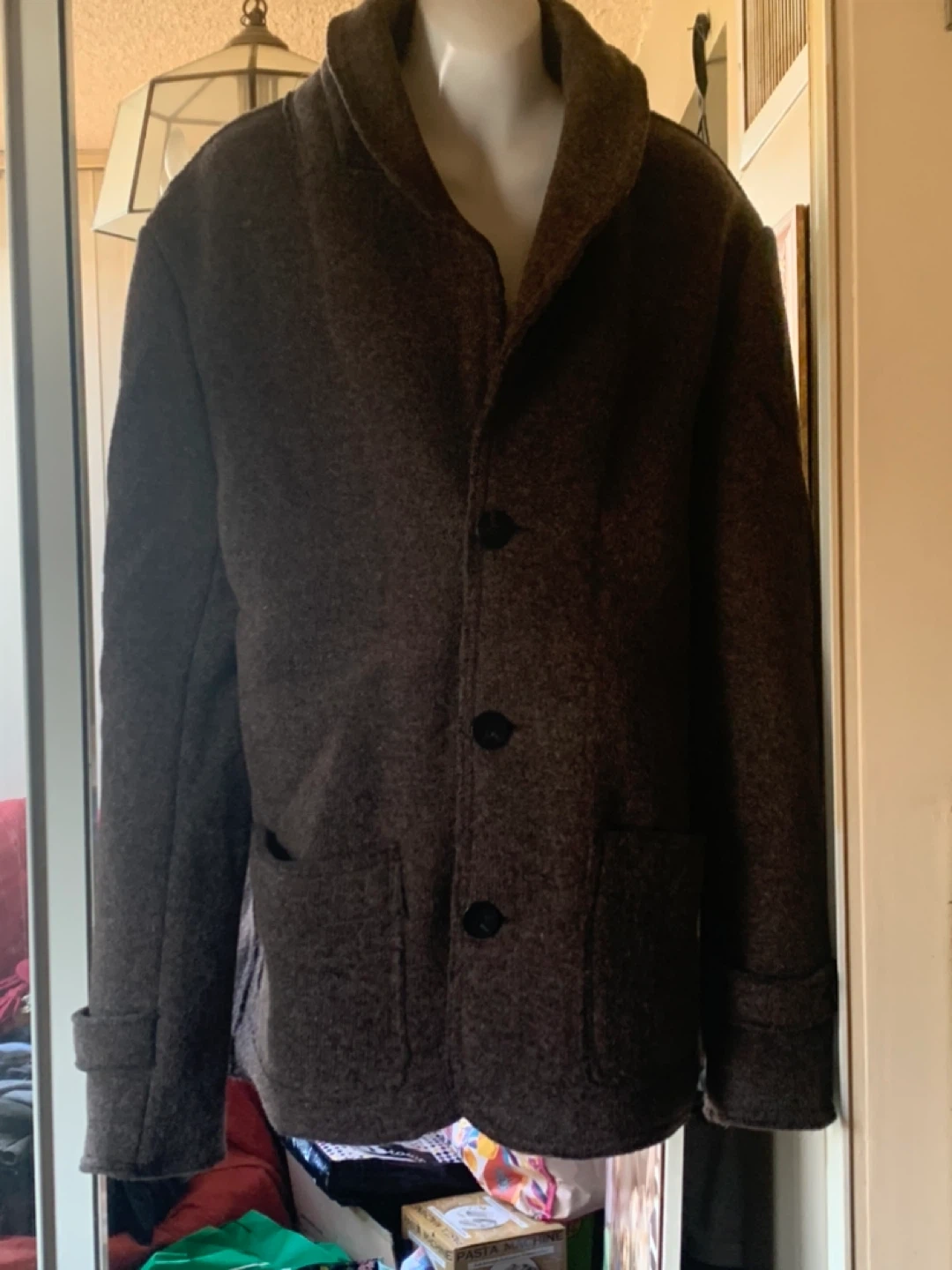 Selling a cozy brown coat with a shawl collar. It's made of a wool blend and has a classic look with front pockets and button closure. Perfect for layering during cooler weather!