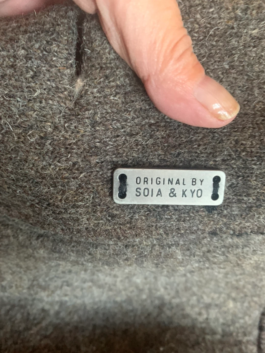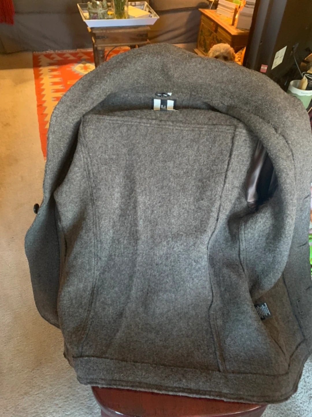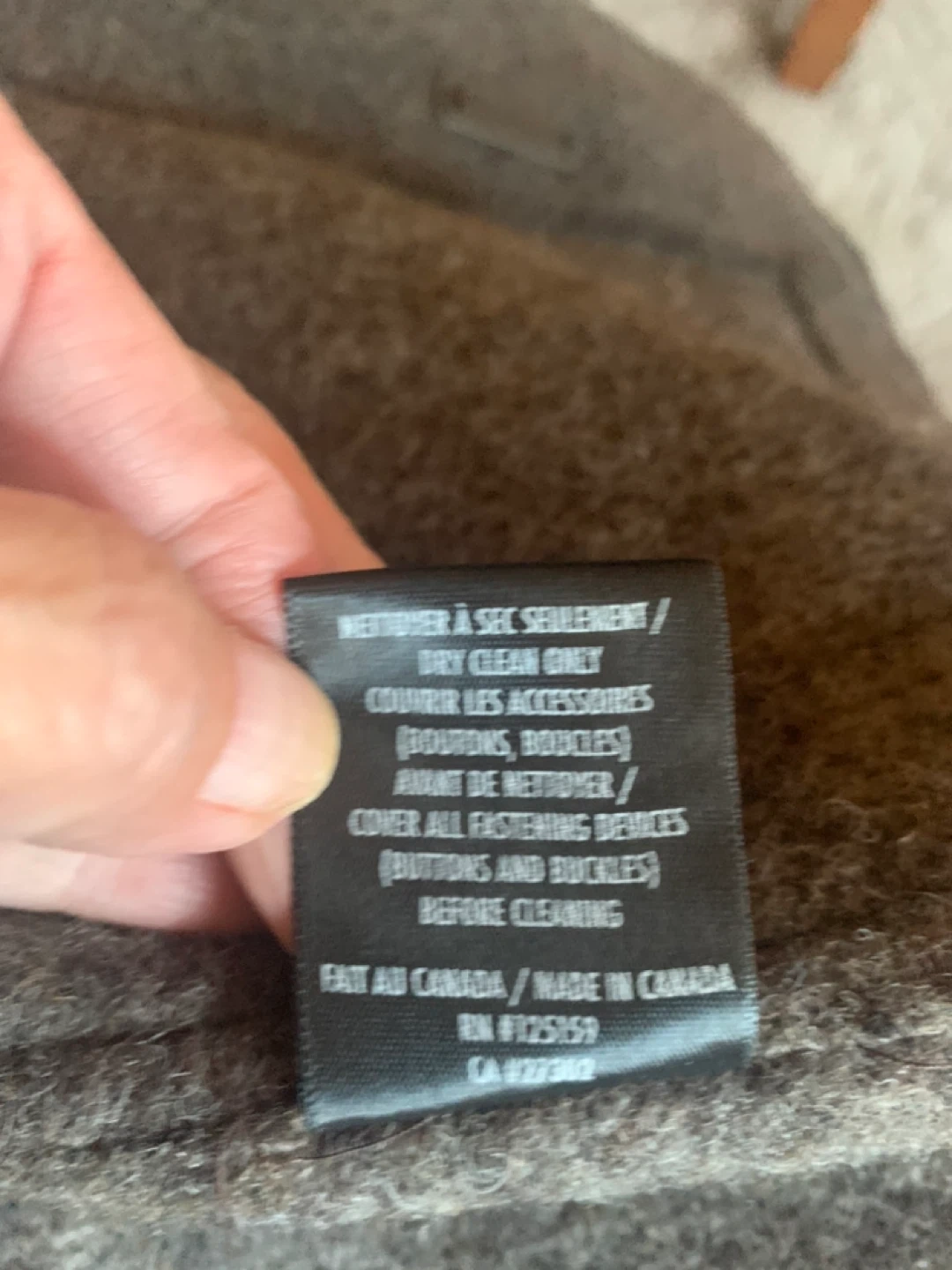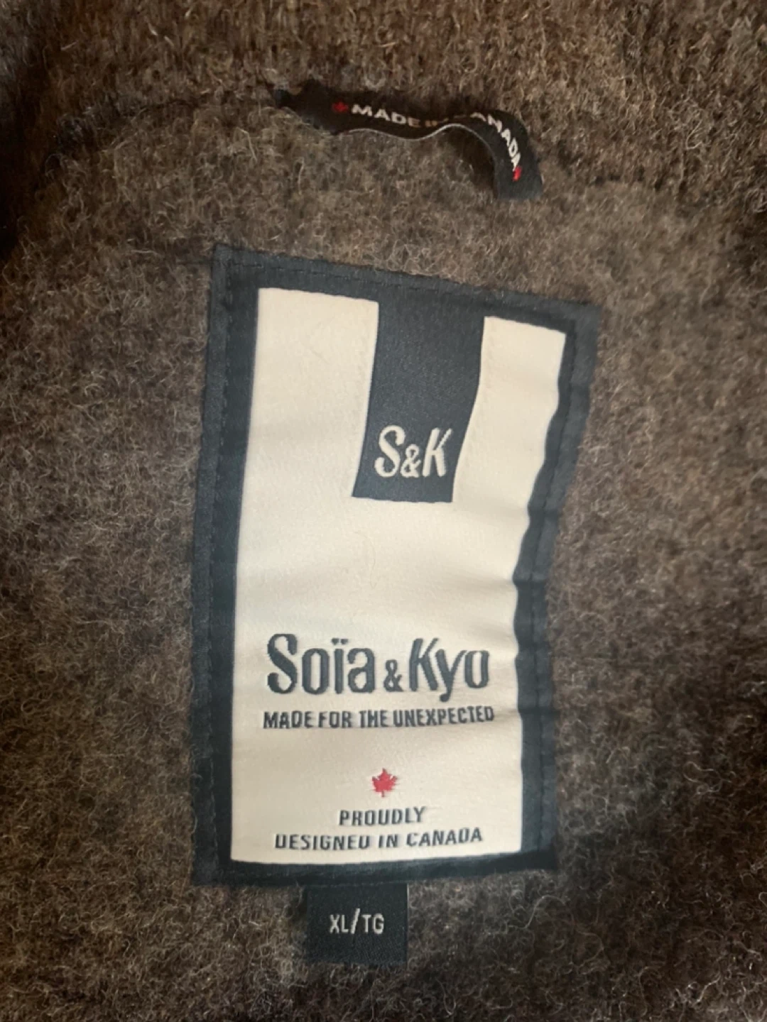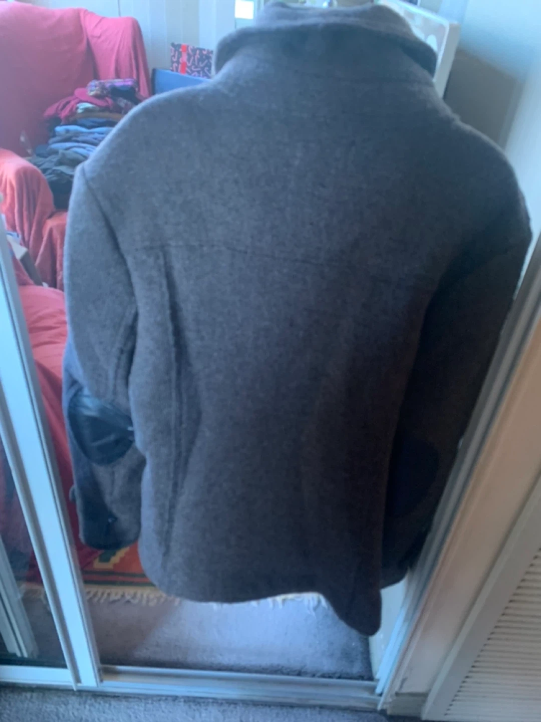 Selling a cozy brown coat with a shawl collar. It's made of a wool blend and has a classic look with front pockets and button closure. Perfect for layering during cooler weather!