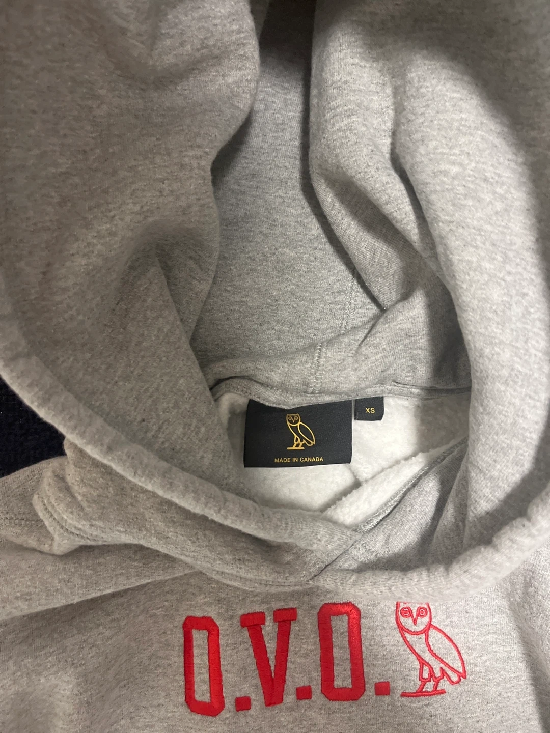Grey OVO hoodie size XS. Features red embroidery OVO logo. The hoodie is in perfect condition.