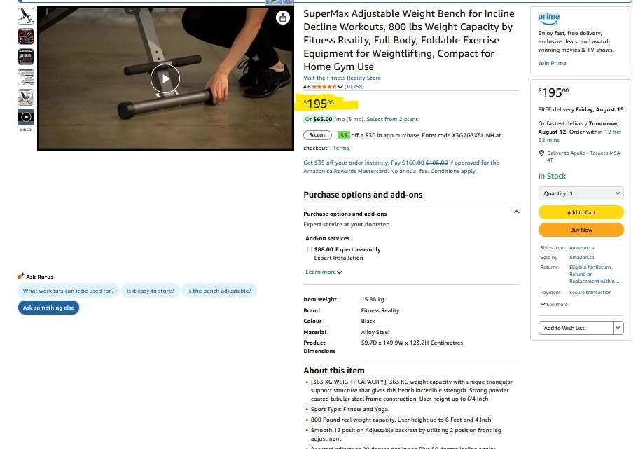 Selling a Fitness Reality weight bench. It's in great shape and ready for your home gym! Perfect for various exercises and adjustable to different positions. measurements from base - length: 141cm, width of legs at seat: 53cm, width of legs at head: 60cm, height: 45cm Amazon page: https://a.co/d/8kGwWQg