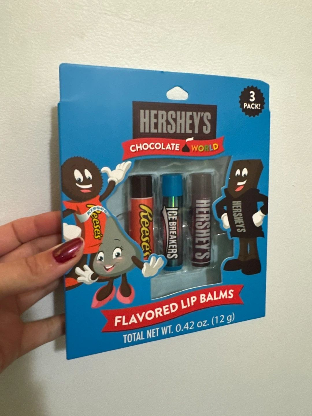 Brand new Hershey's Chocolate World flavored lip balms, 3 pack! Total net weight 0.42 oz (12 g). Flavors include Reese's, Ice Breakers, and Hershey's