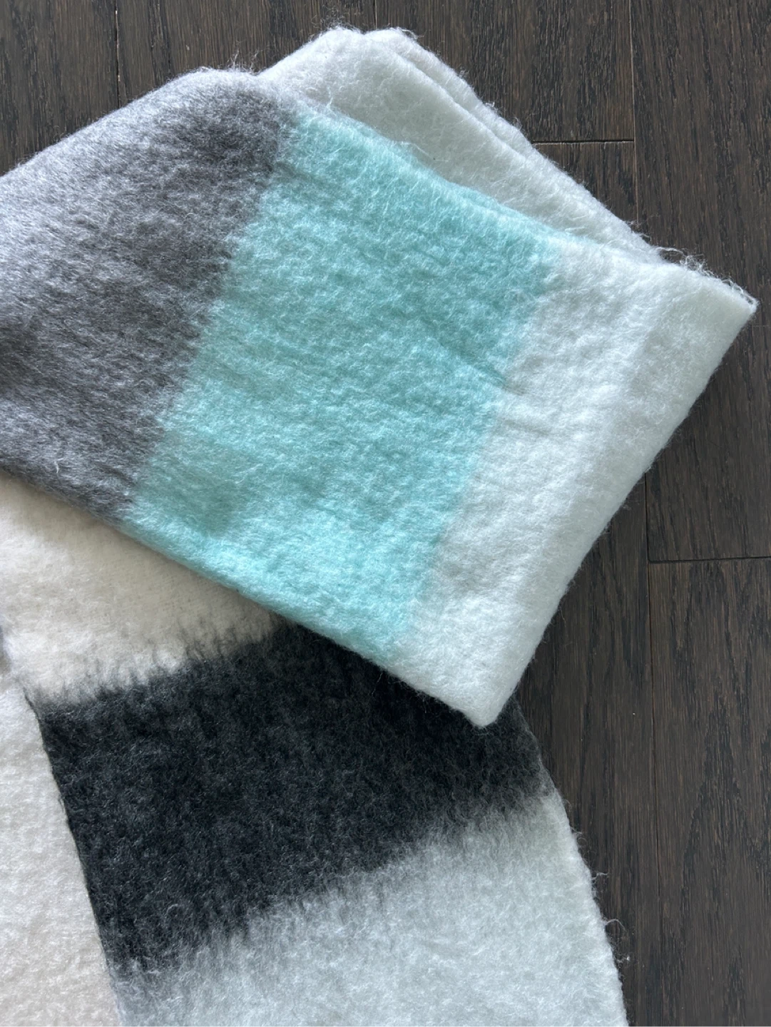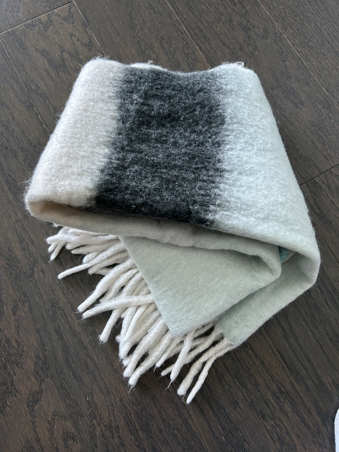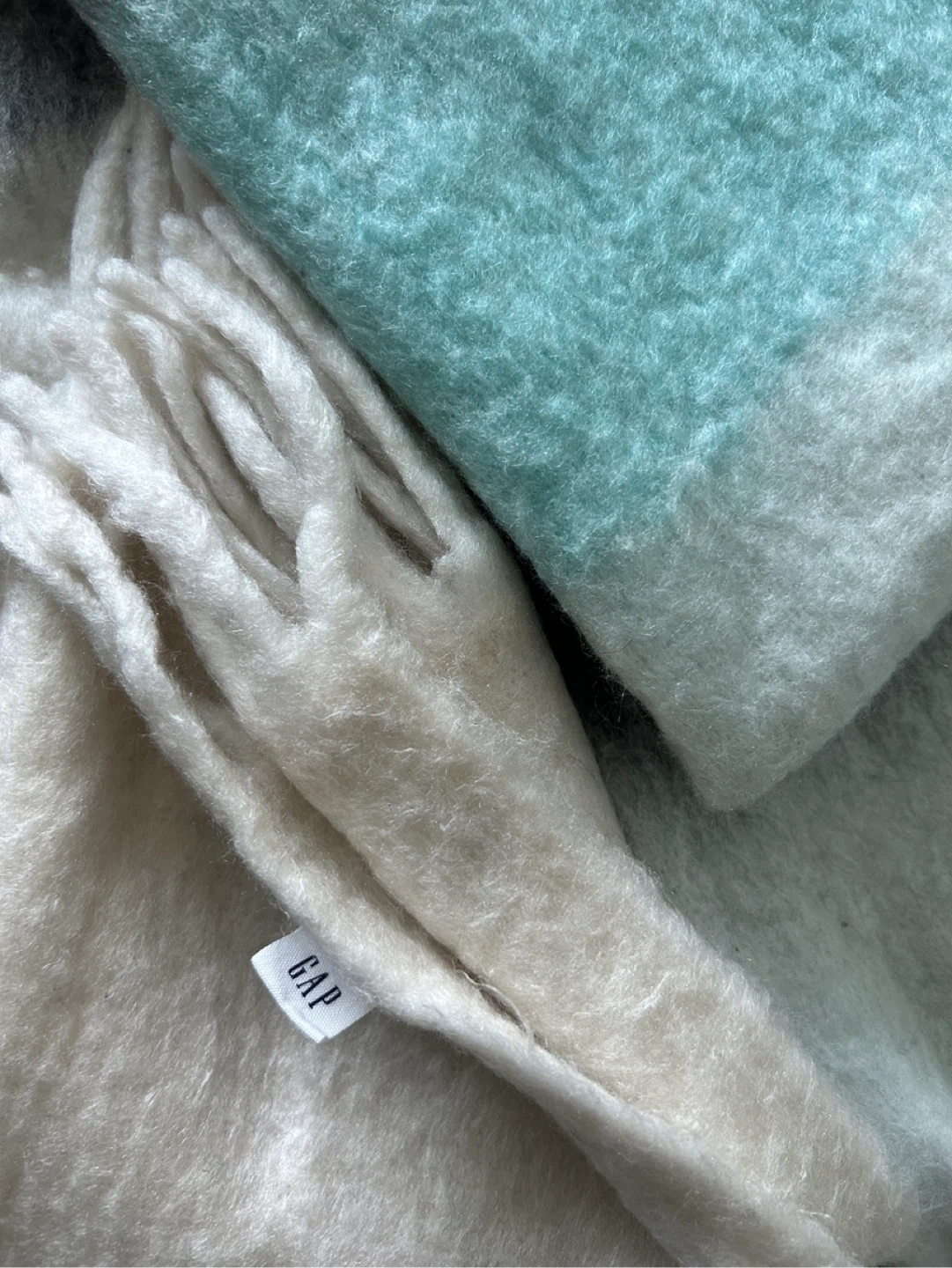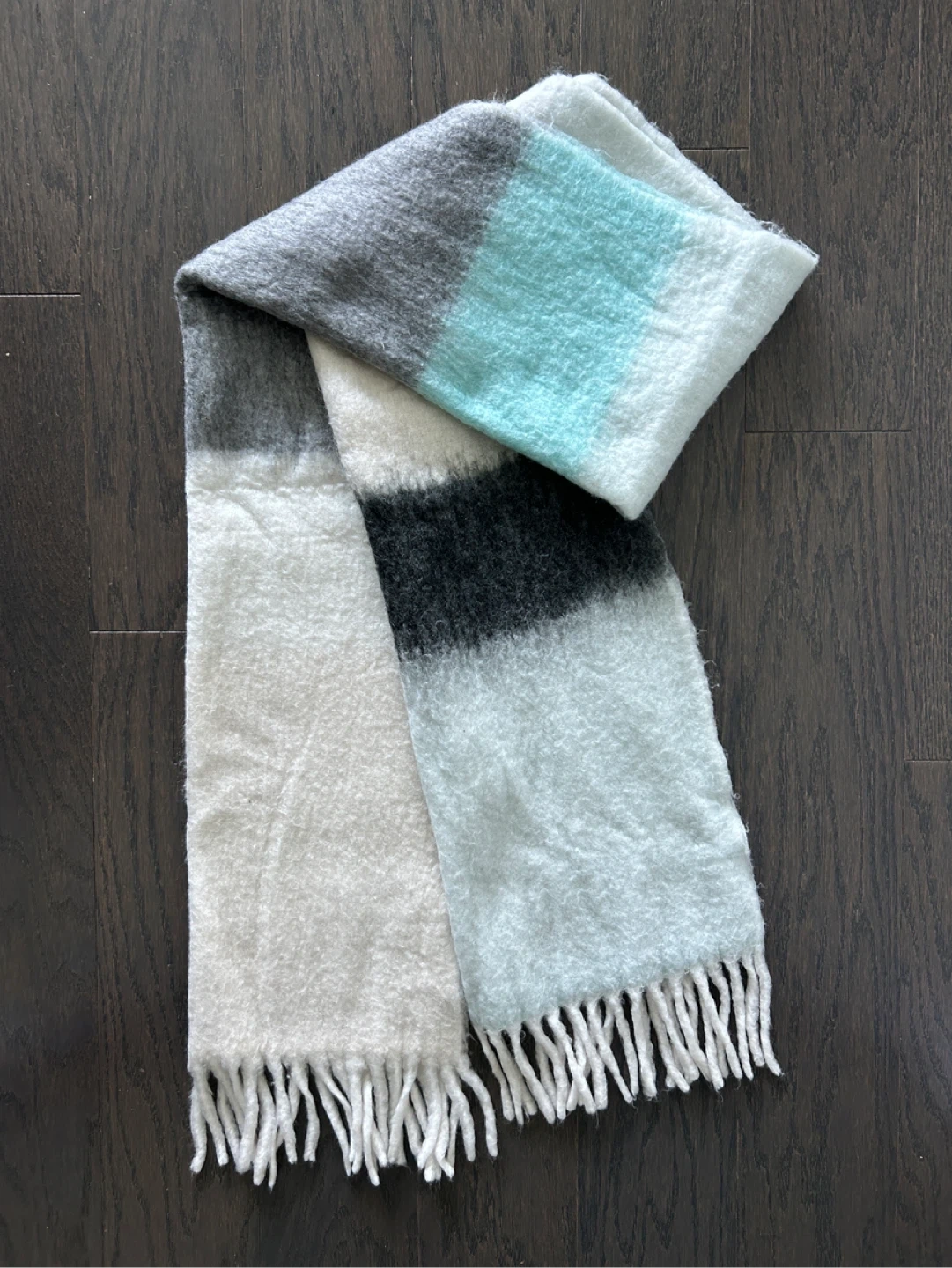 Cozy and stylish oversized GAP scarf for sale! This scarf features a lovely striped pattern in grey, white, and teal. It's perfect for adding a touch of warmth and style to any outfit during the colder months. The material is soft and comfortable, making it a great accessory for everyday wear