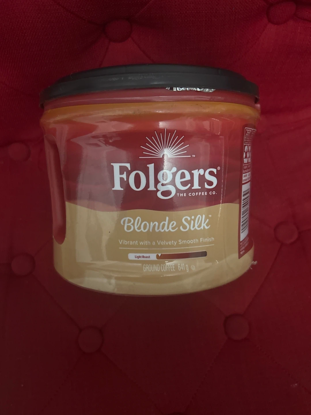 Large (641g) Selling a container of Folgers Blonde Silk ground coffee. It's a light roast with a velvety smooth finish, perfect for starting your day. The container has 641g of coffee Retail: $18.63