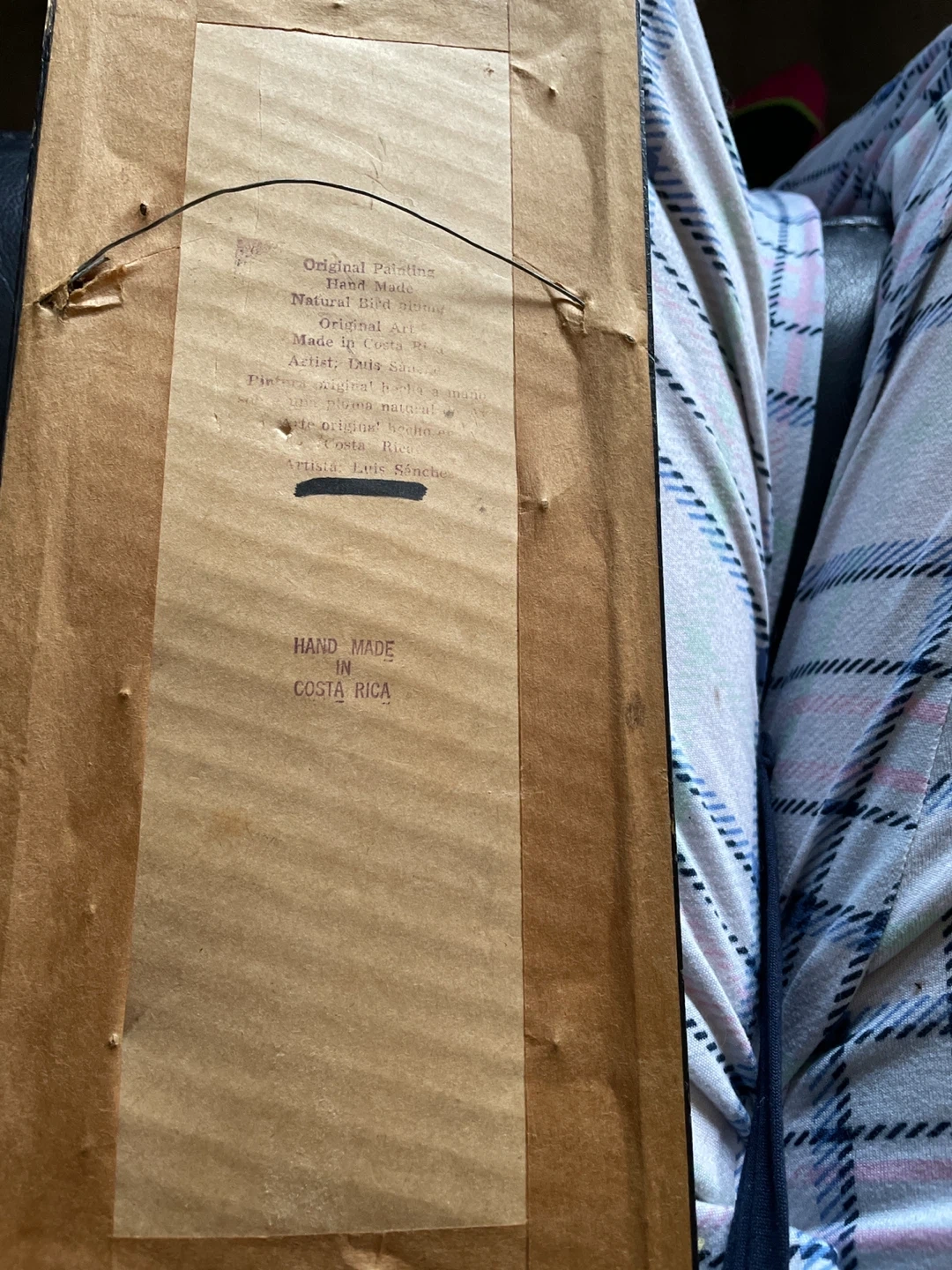 Selling a framed painting of a bird feather. It's hand made in Costa Rica. The painting features colourful birds. It would be a great addition to any room!