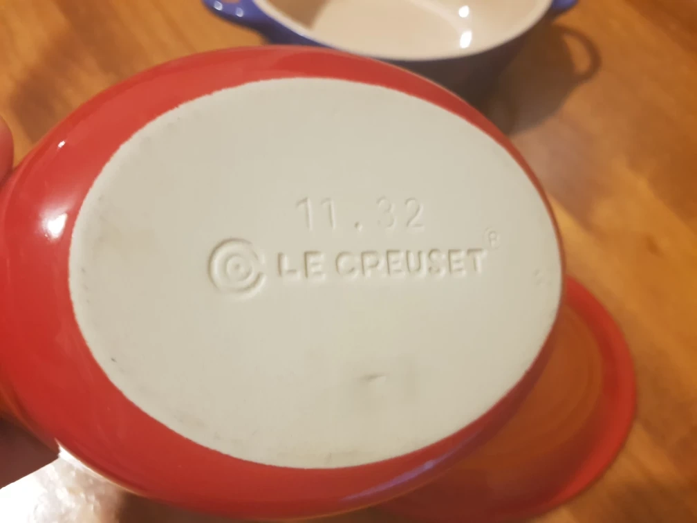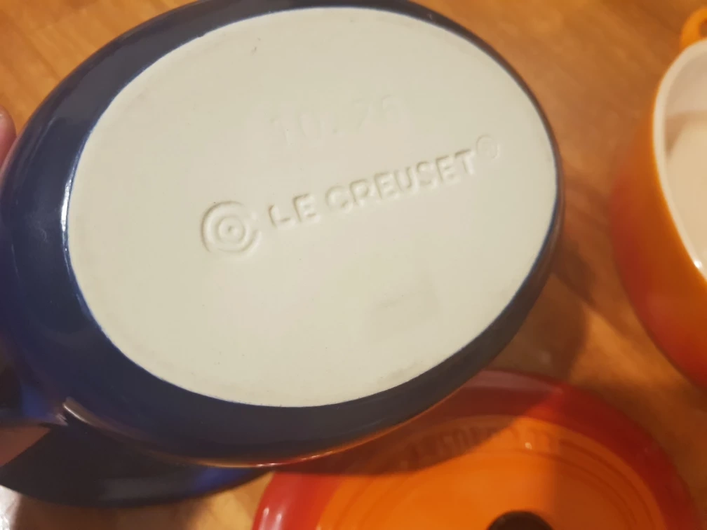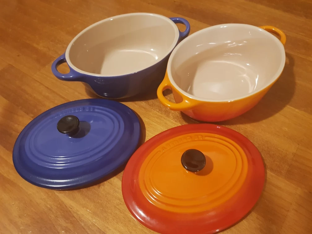 Selling two Le Creuset mini cocottes! One is a lovely blue and the other is a vibrant orange. They're perfect for individual servings or dips.