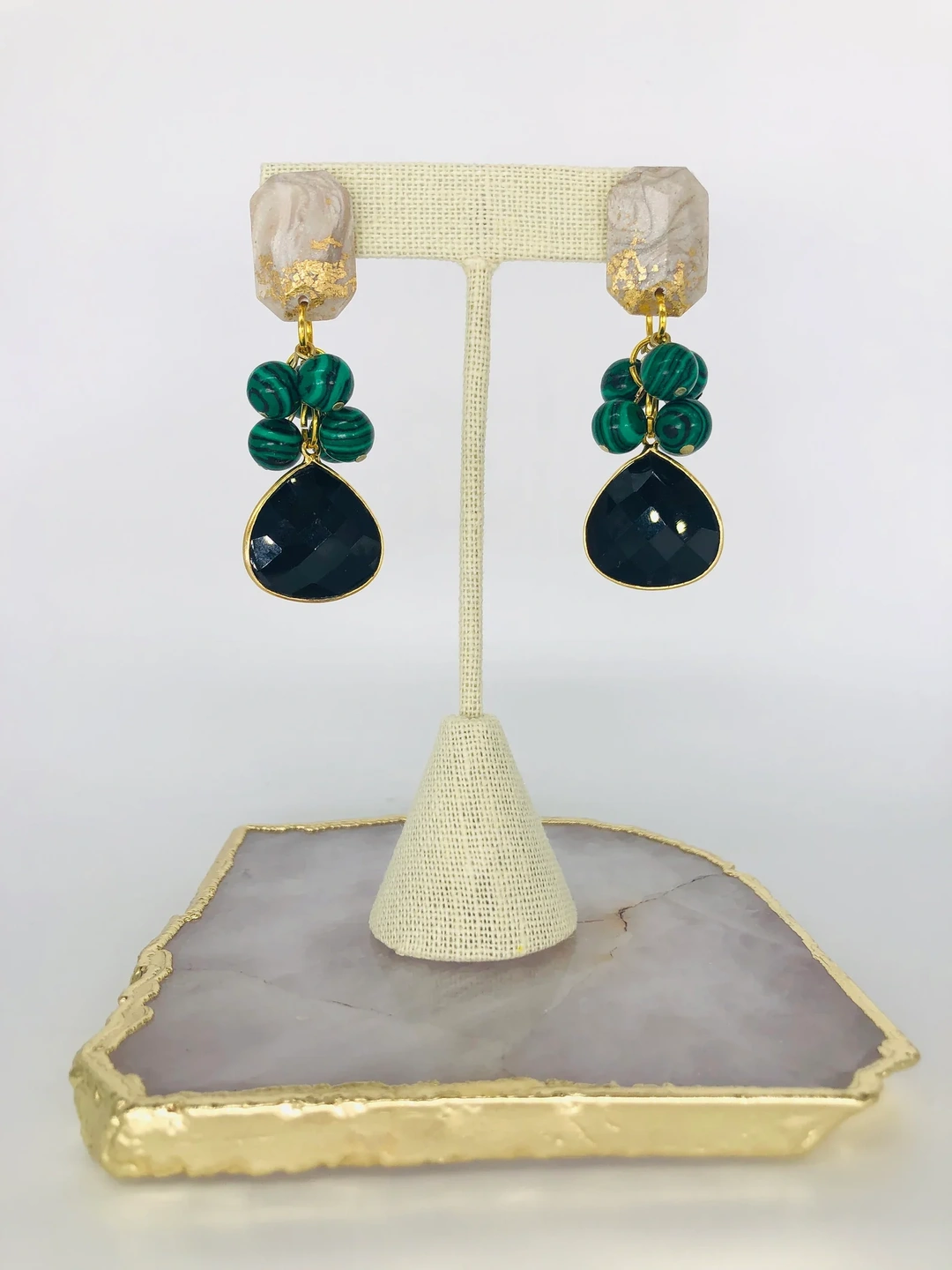 Designed by Sarah Jasken Gemstone: Onyx Pearly White Clay Faceted Emerald Shape Post with Gold Foil Accent + Malachite Stone Bead Dangles + Faceted Onyx Gemstone Drop Earrings. Handmade. Approx 2” length Pick-up from Yorkville.