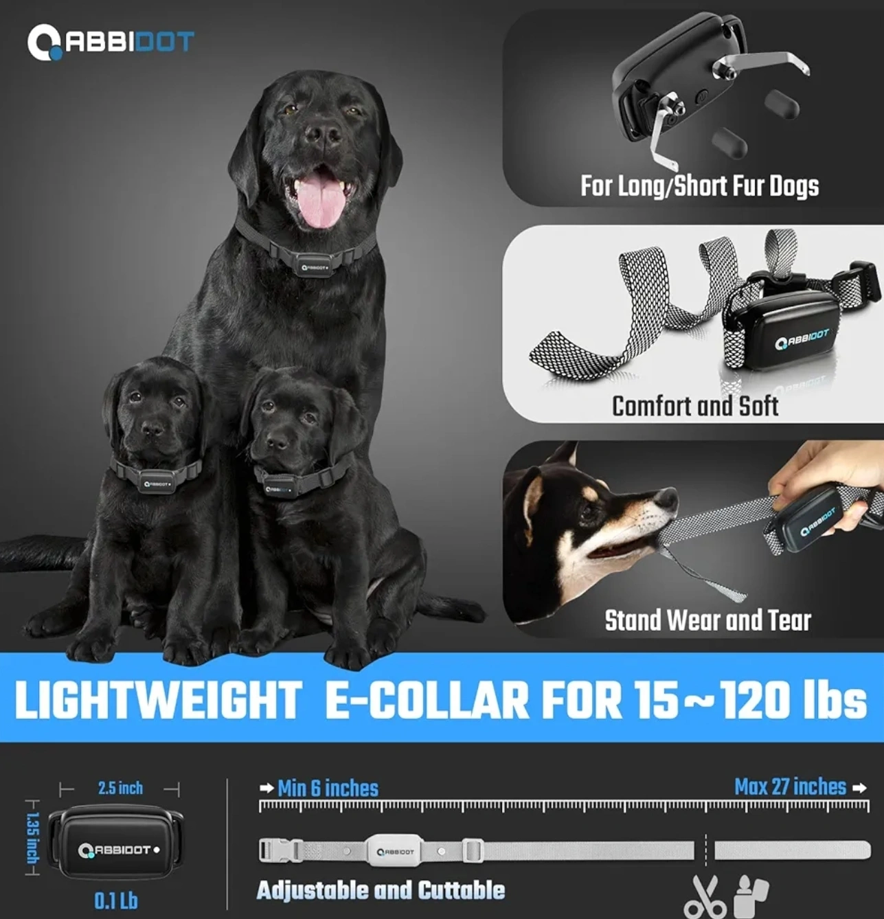 Looking to train your furry friend? This Abbidot E-Collar is designed for dogs weighing between 15 and 120 lbs. It features adjustable and cuttable straps for a comfortable fit. The collar is lightweight and made to be comfortable and soft for your dog. The remote has a high-definition LCD screen that is easy to view day or night. The collar also features long-lasting battery life.