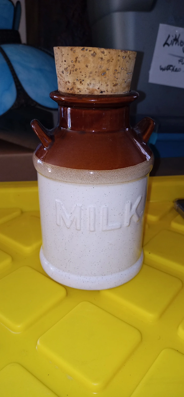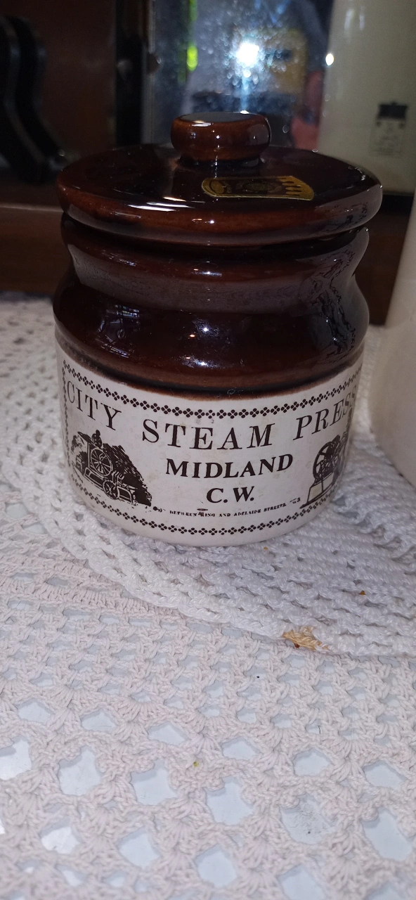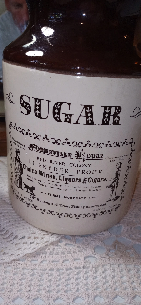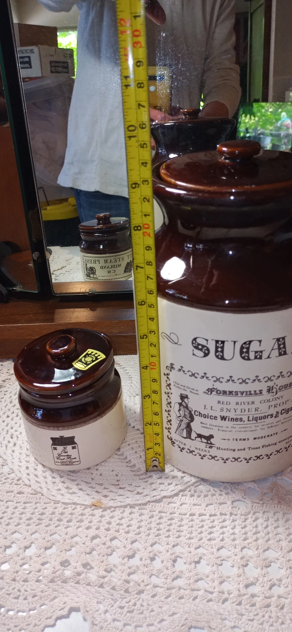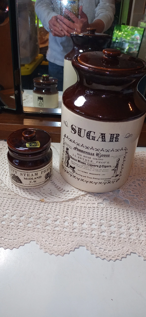 Selling a vintage brown and white sugar crock, labelled 'Sugar Forksville House'. It's quite tall, about 10 inches! Also included is a smaller jar labelled 'City Steam Press Midland C.W.' Both are in great condition and would look lovely in any kitchen or vintage collection. Will throw in a milk jar too with cork top. Vintage and part of Canadiana produced ceramics. Price for all 3 pieces.