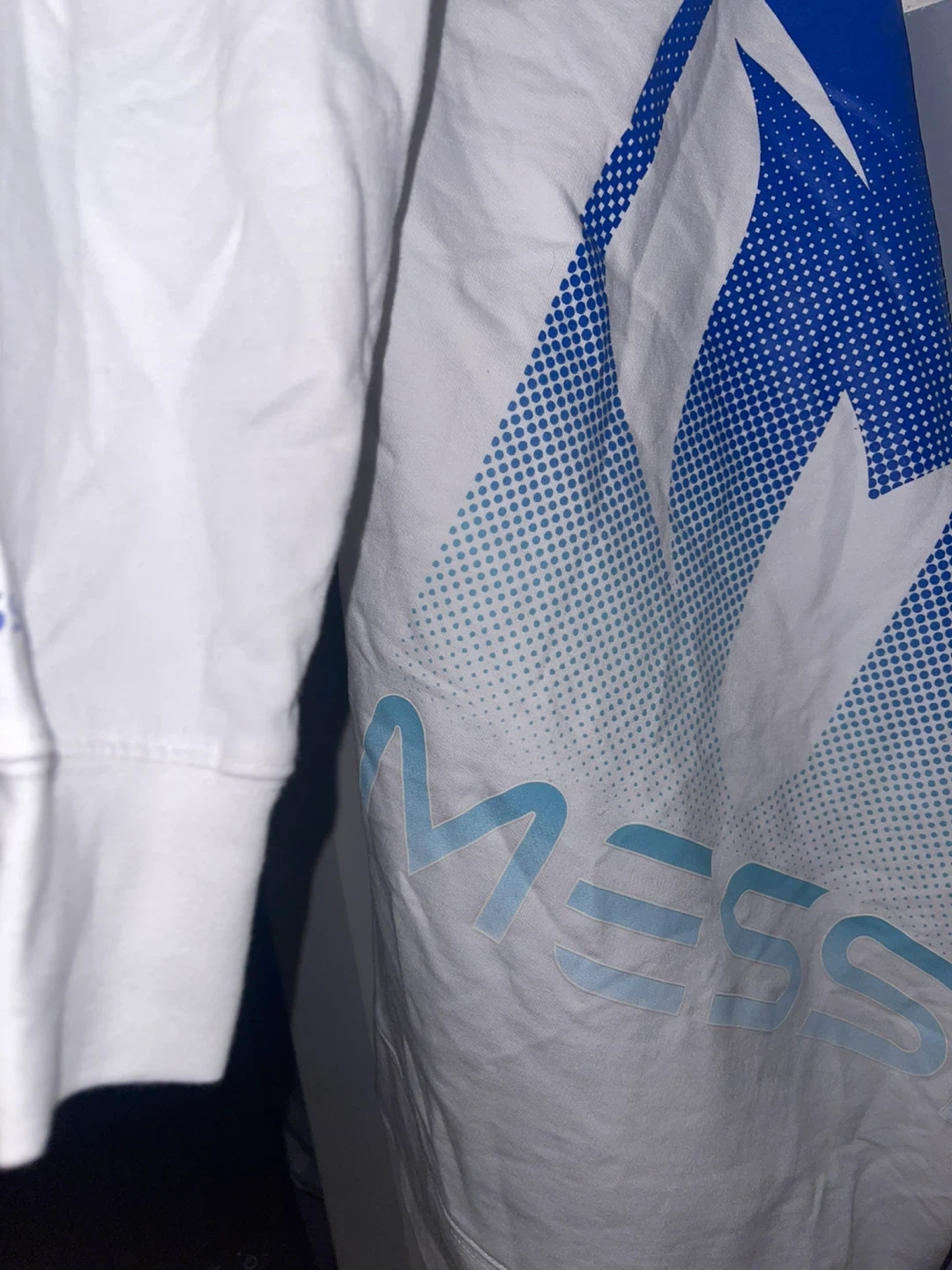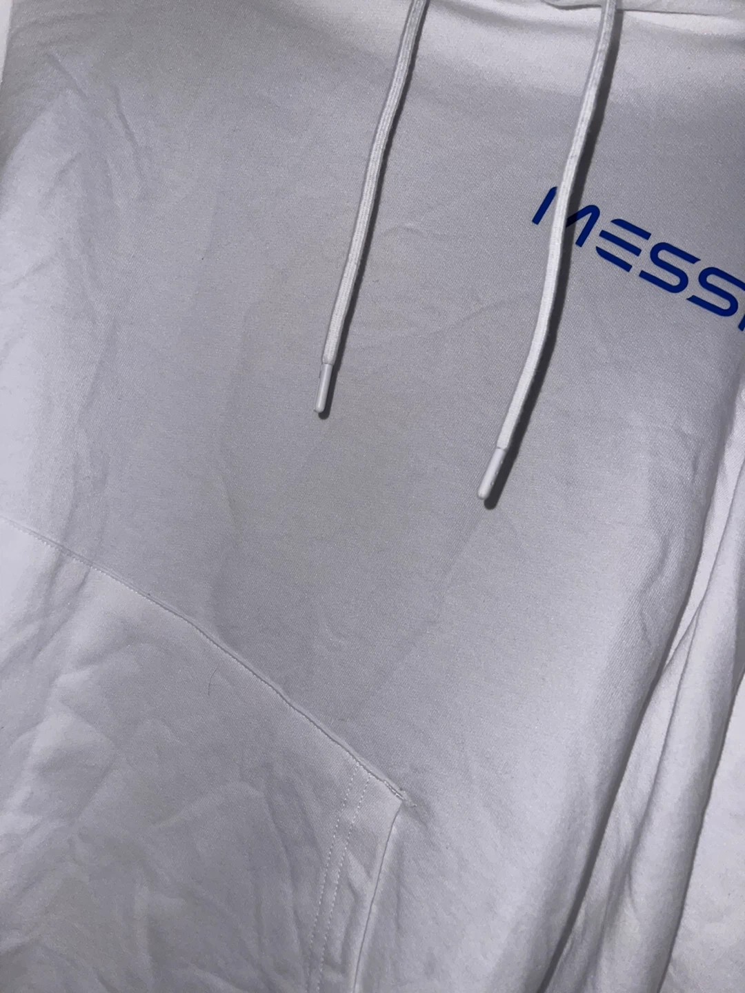 Selling a white Messi hoodie in size small. It's in great condition and features the Messi logo in blue. Perfect for any soccer fan!