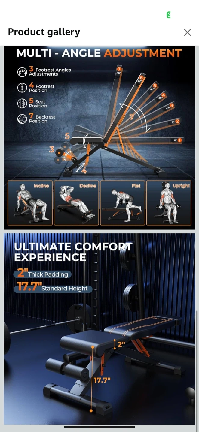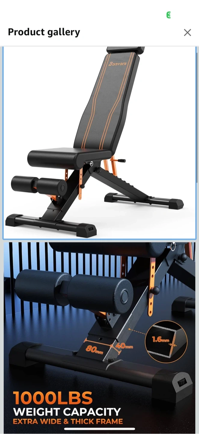 Selling an adjustable weight bench. It features multi-angle adjustment for various exercises. The frame is extra wide and thick and has a 1000lbs weight capacity. It also has 2" thick padding and is 17.7" in height