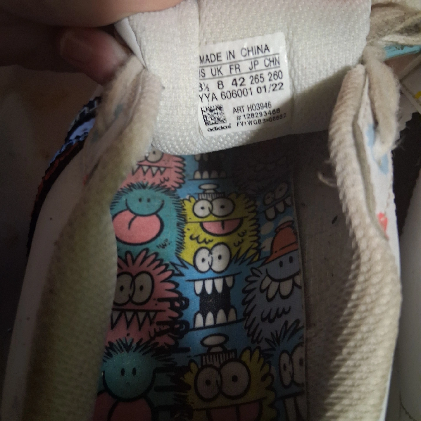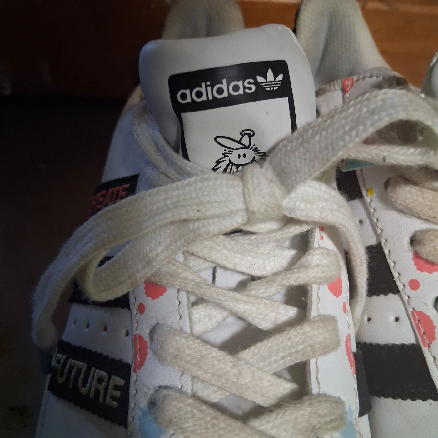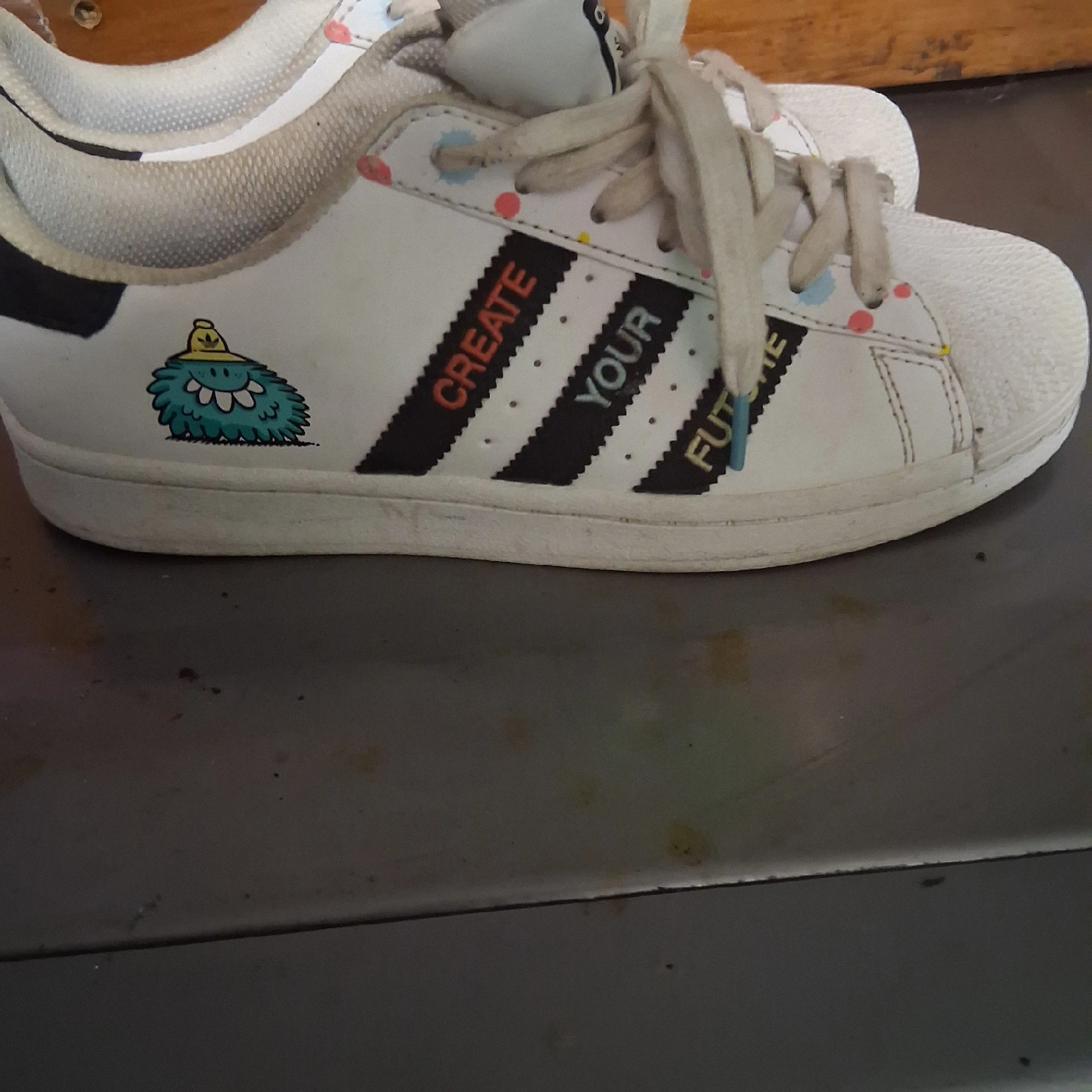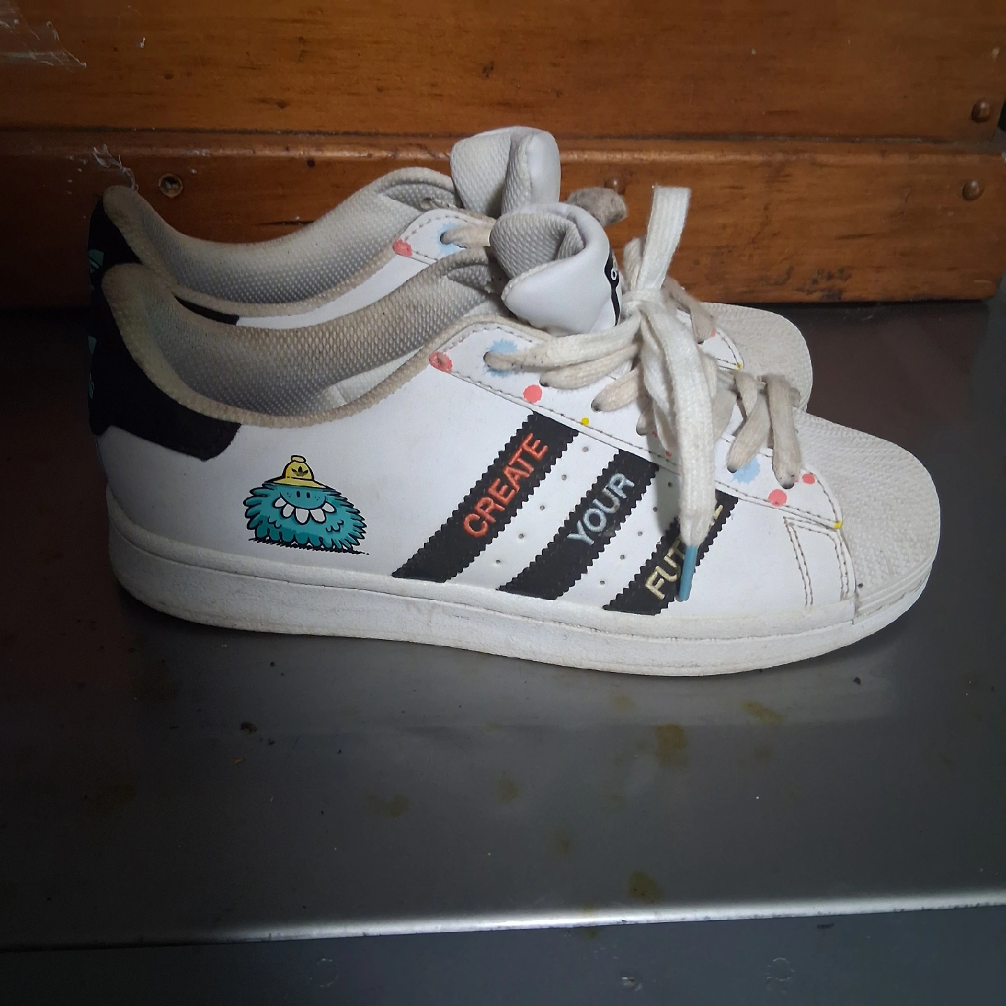 Selling a pair of Adidas Superstar Adidas x Kevin Lyons collaboration They're a mens size 8 and feature a fun, colourful design with a cute monster graphic and the words 'CREATE YOUR FUTURE' along the side. They have only been worn twice outside for ten mons each approximately. Limited edition n( I wish I had of kept box lol) pick up in Bayside or Delivery for an extra fee checkout my other listing's .