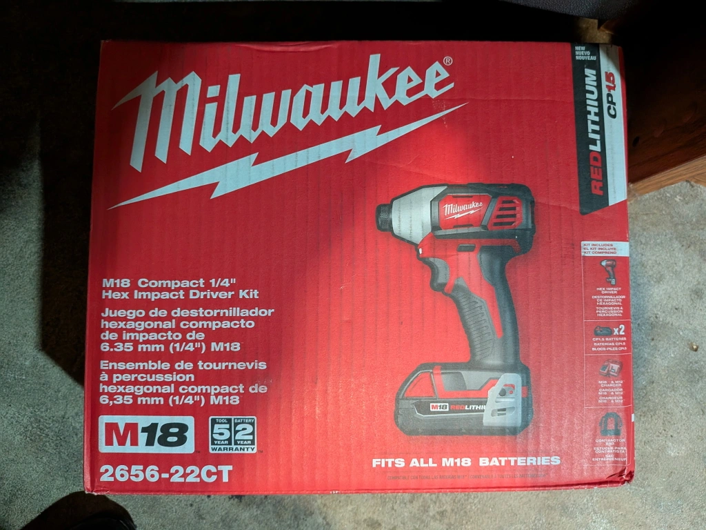Selling a brand new Milwaukee M18 Compact 1/4" Hex Impact Driver Kit! It's the 2656-22CT model and is compatible with all M18 batteries. Comes with two CP1.5 REDLITHIUM batteries.