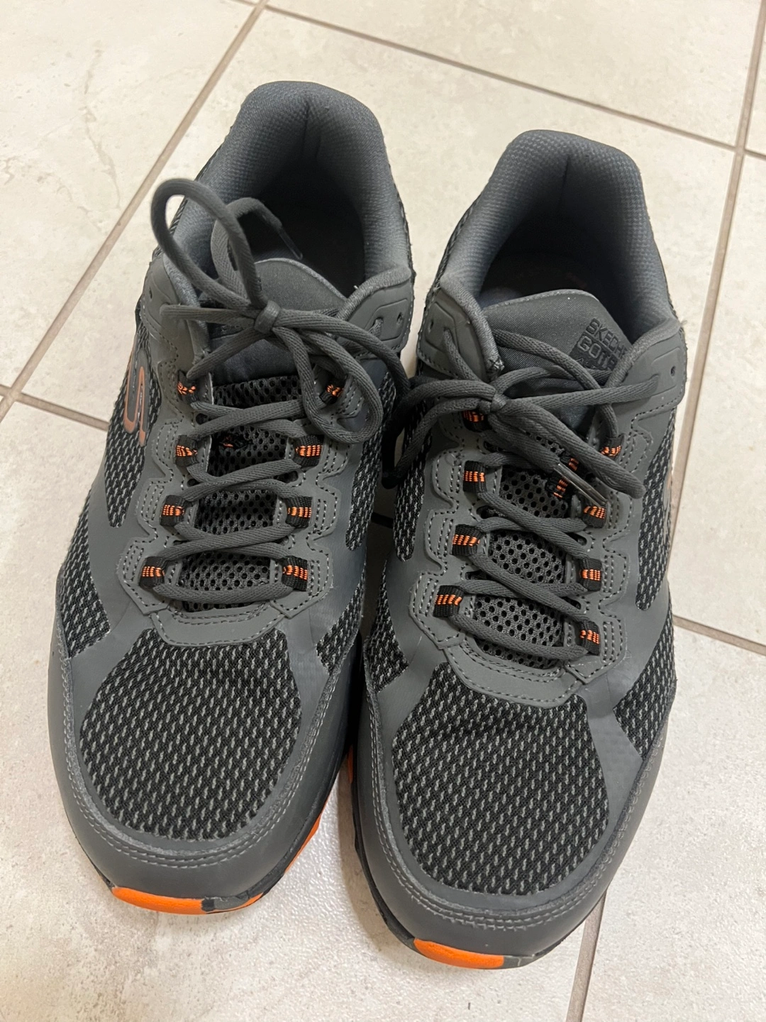 - Skechers GOtrail men's shoes - water repellent and great for light hiking or everyday wear - size : US 10 - colour : grey with orange accents