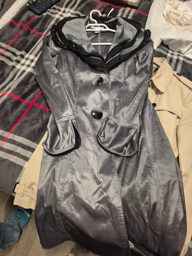 Selling a Joseph Ribkoff long coat in a beautiful silver grey colour. It's a size 8. The suggested price on the tag is $369.95. This coat is made in Canada! you can adjust the colour to stay up or go down. very nice dress coat.