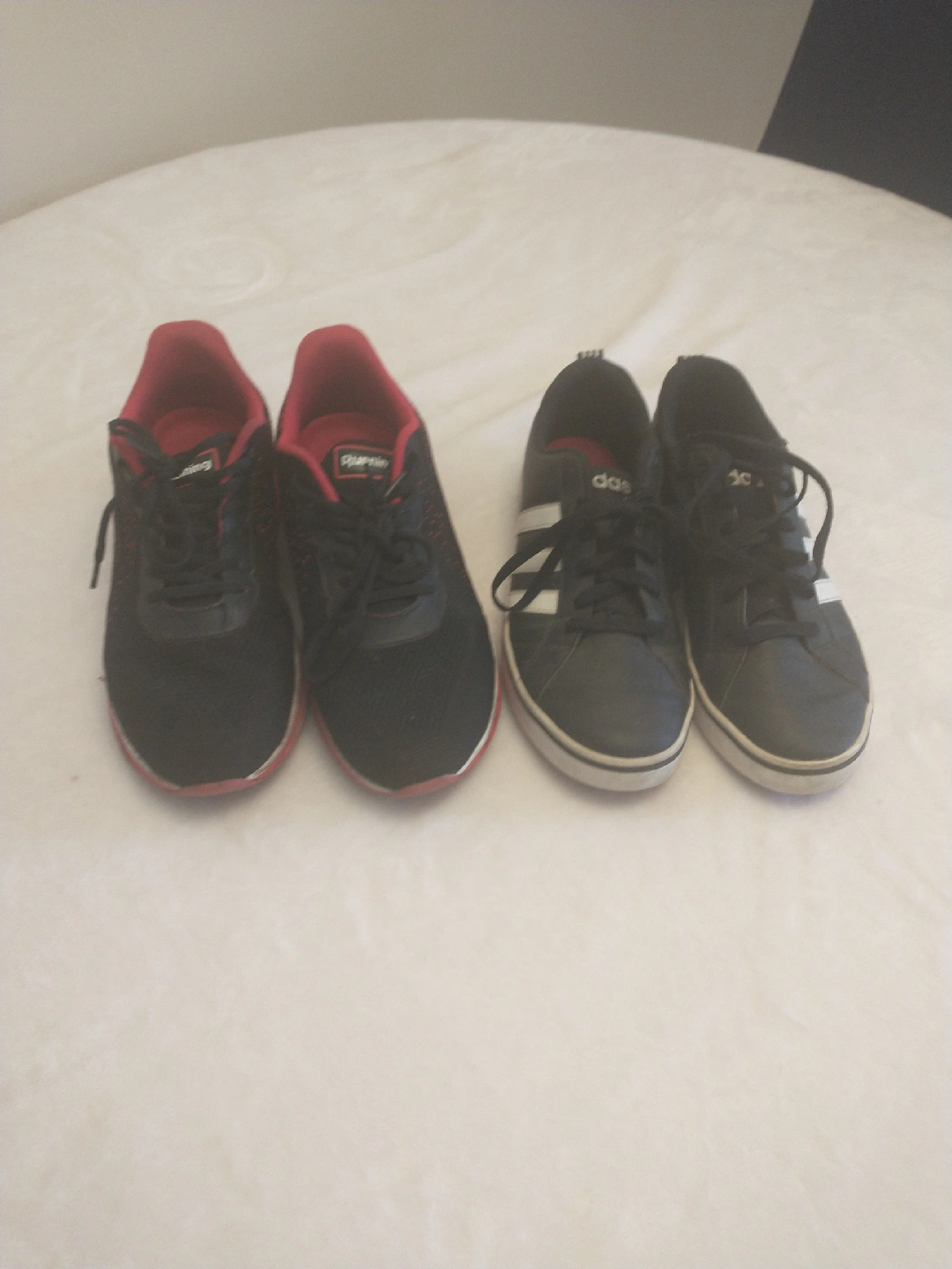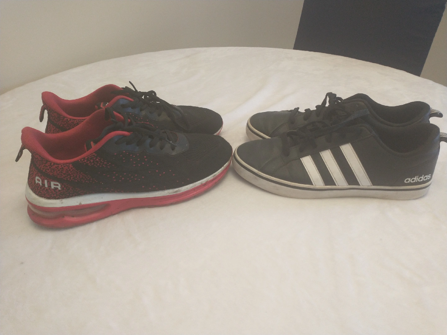 Selling two pairs of used men's shoes.. One pair is black and red 'AIR' running shoes, and the other is a black Adidas shoe with white stripes. Worn but in good condition. Men's Size 8 Selling both together $20 Pick up only near Weston Rd and Black Creek area