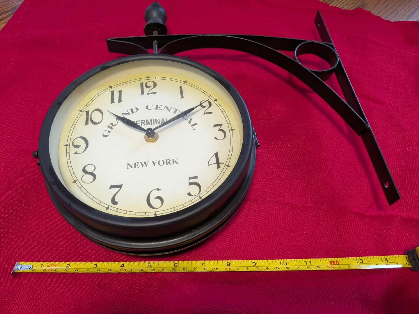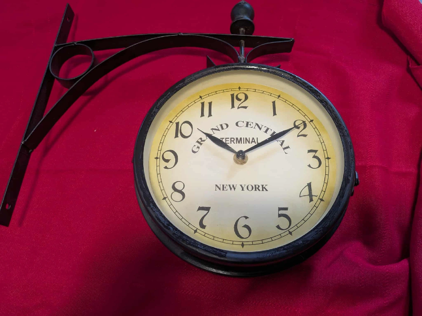 Here's a charming Grand Central Terminal New York wall clock! It features a double-sided design and a black metal frame. The face has a vintage look with classic numerals. Perfect for adding a touch of old-world charm to any room!
