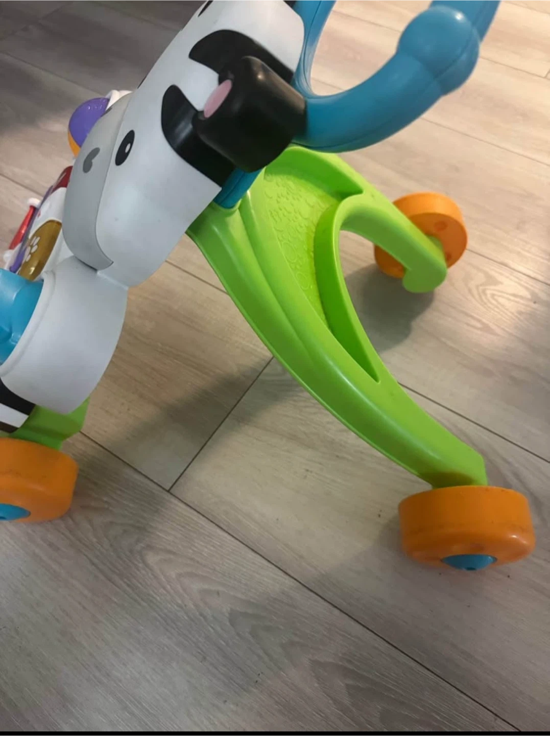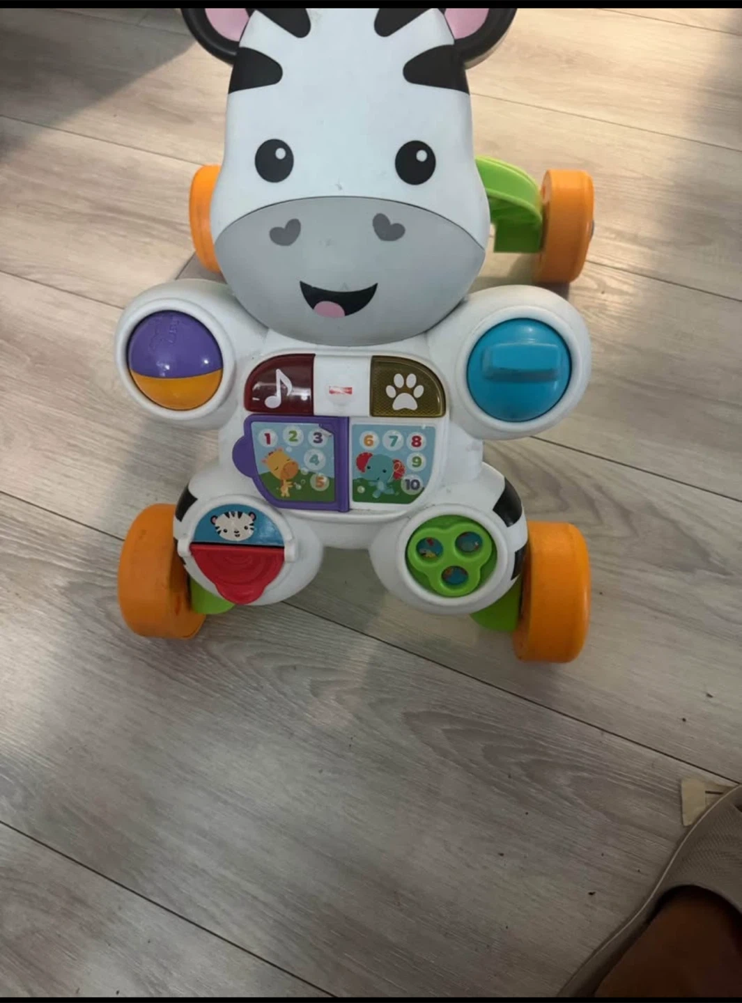 This Fisher-Price Learn with Me Zebra Walker is perfect for your little one! It's in great condition and ready for a new home. It helps babies learn to walk while providing interactive fun with lights, sounds, and activities on the front panel