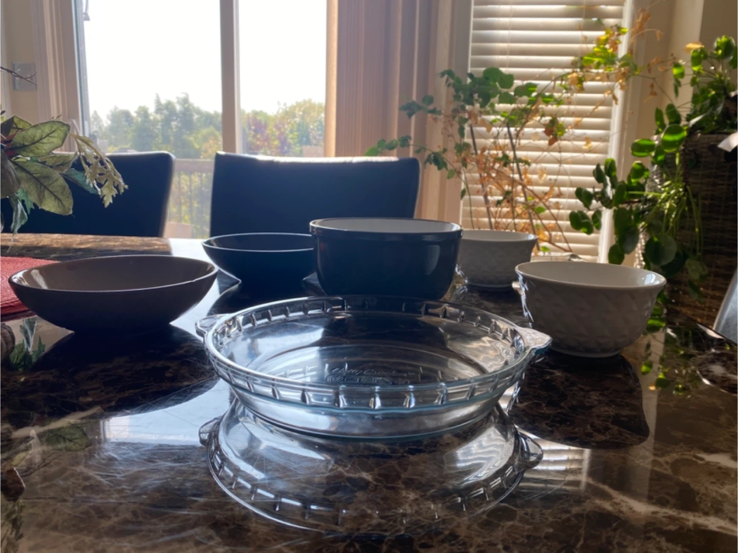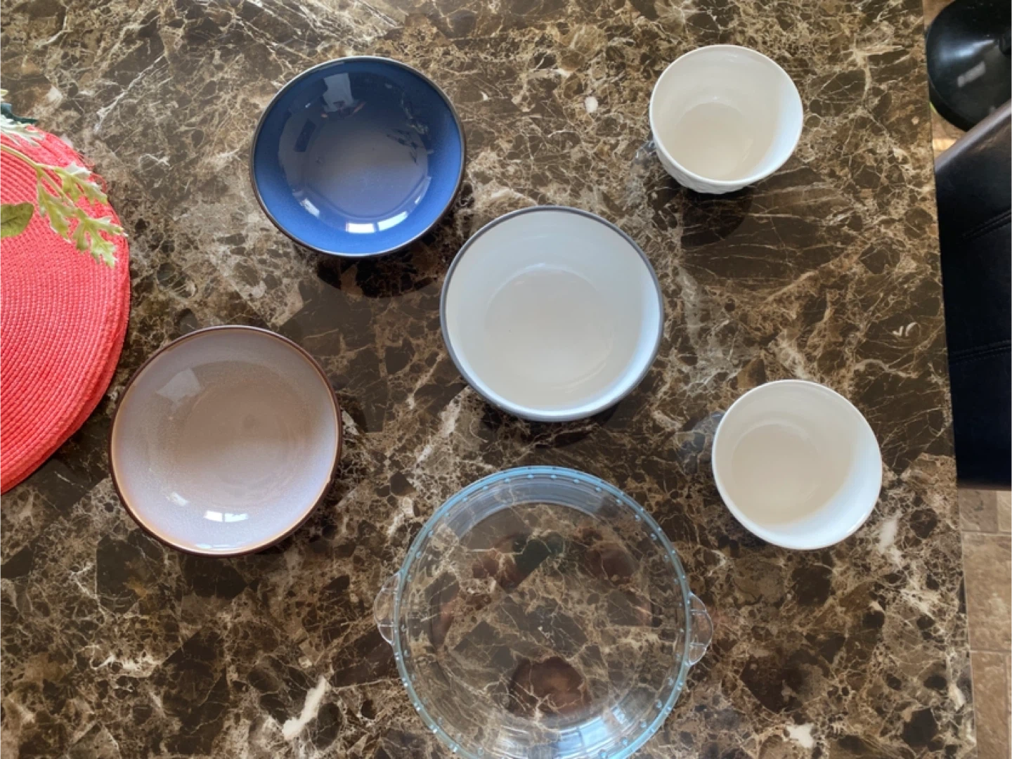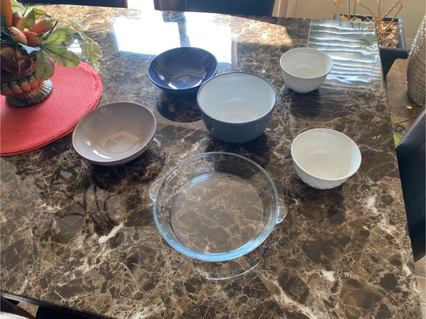 Selling a set of assorted bowls and a glass baking dish. The bowls come in various colours and sizes. The glass baking dish is perfect for pies or casseroles. They're all in great shape and ready for a new home!