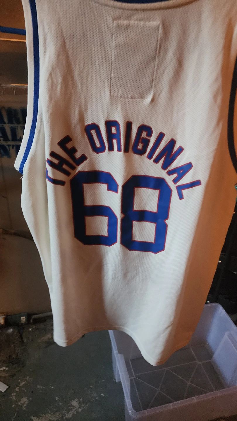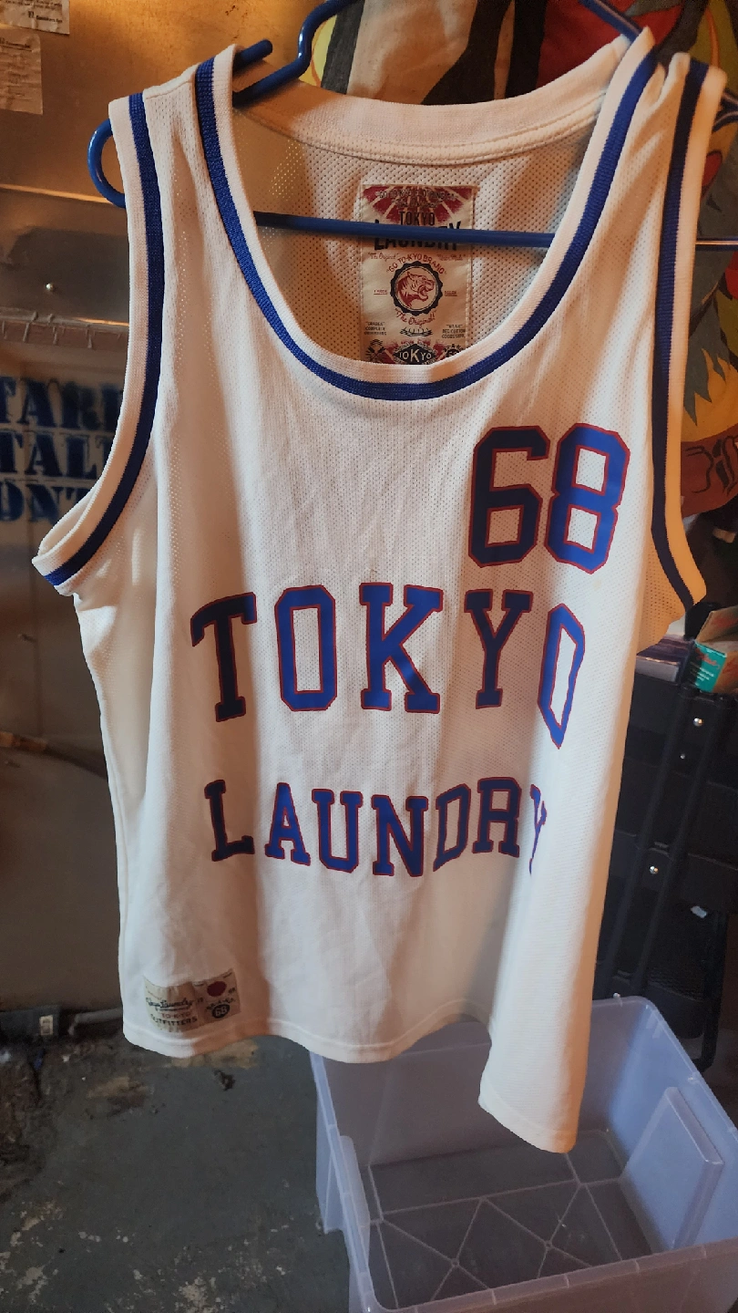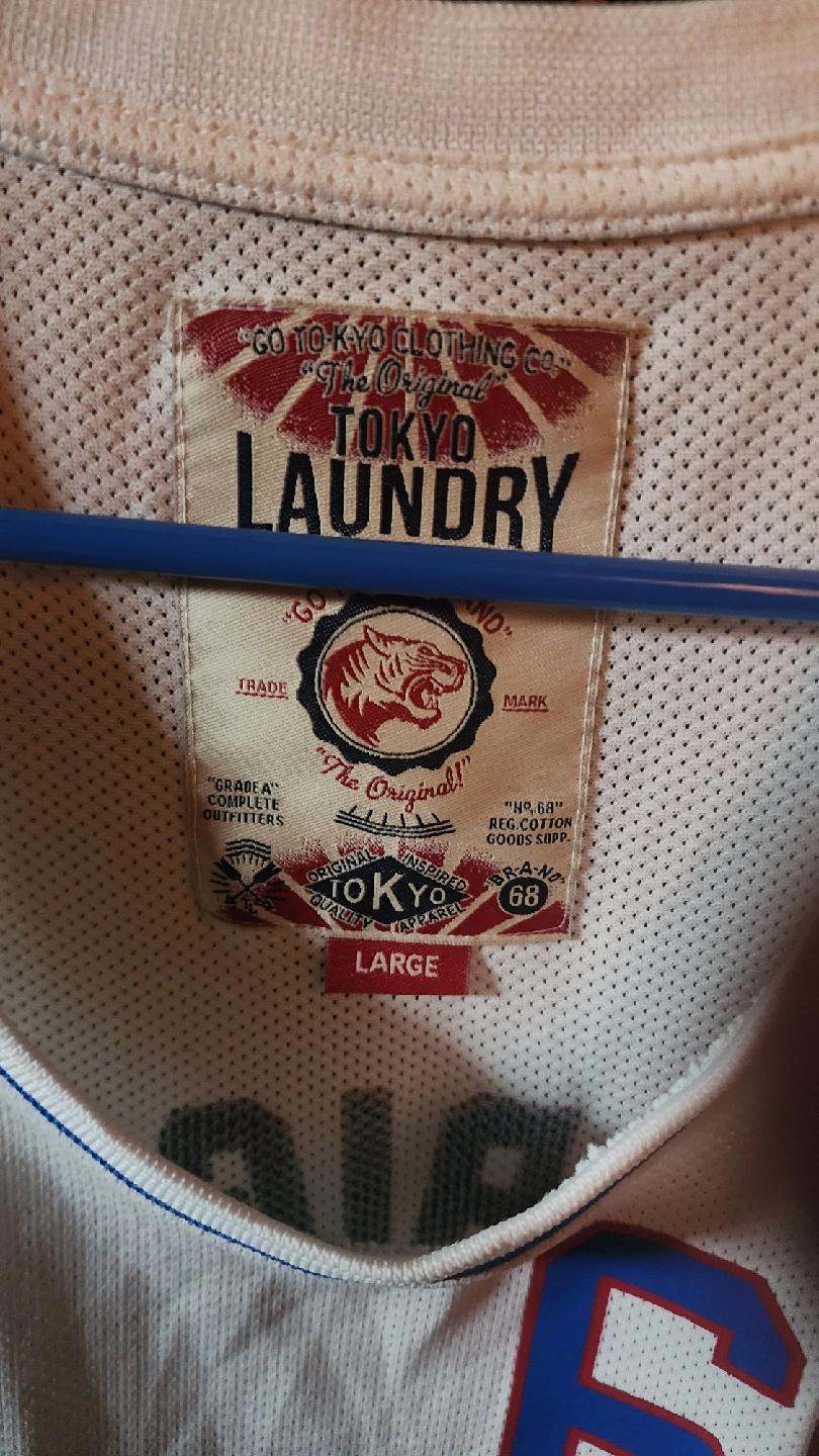 Selling a Tokyo Laundry jersey with "The Original 68" design. It's a size large and made of cotton. The colours are white with blue accents. Perfect for casual wear or sports!