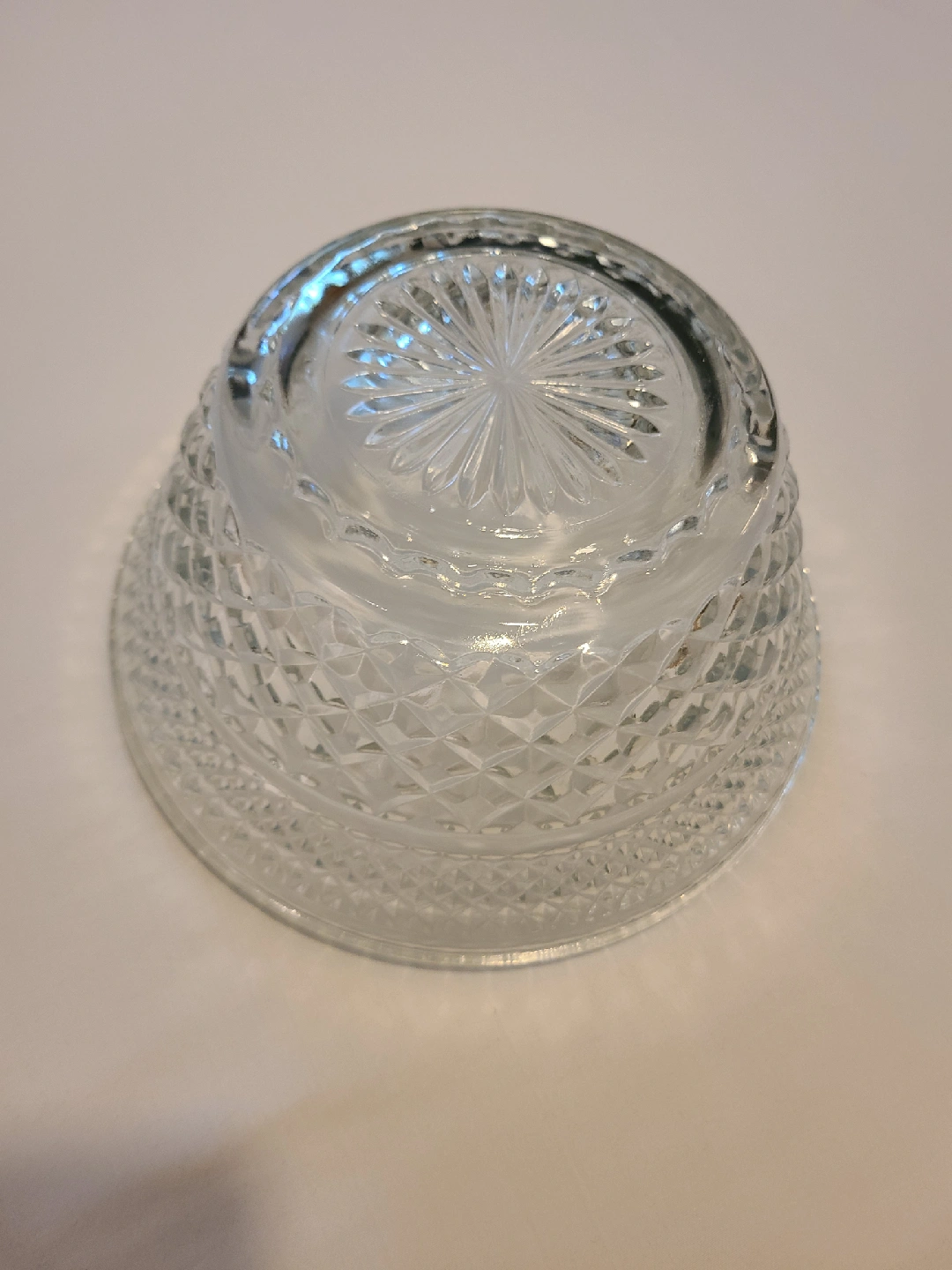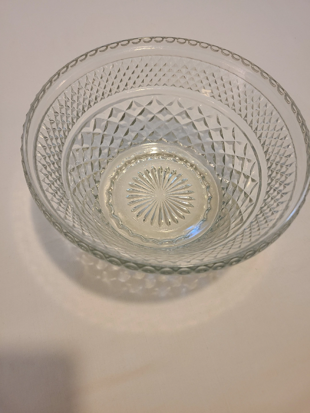 Selling a beautiful crystal glass bowl. It features a lovely diamond pattern and a decorative rim. Perfect for serving or as a decorative piece! Top diameter 24 cm / 9.5" Base diameter 11.5 cm / 4.5" Height 12 cm / 4.75" From a pet-free, smoke-free home Porch pickup near Bathurst station