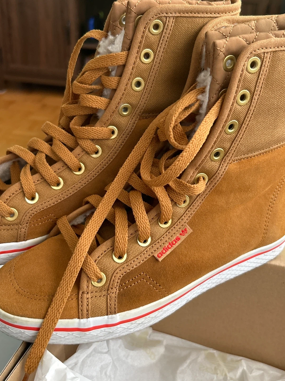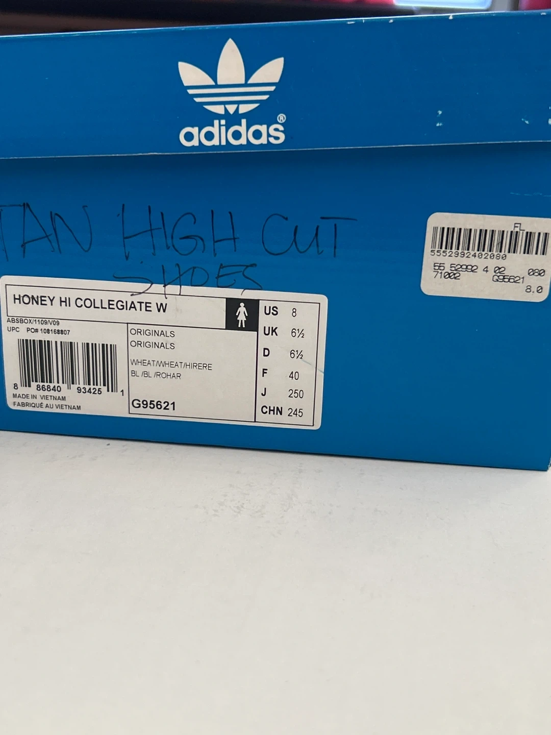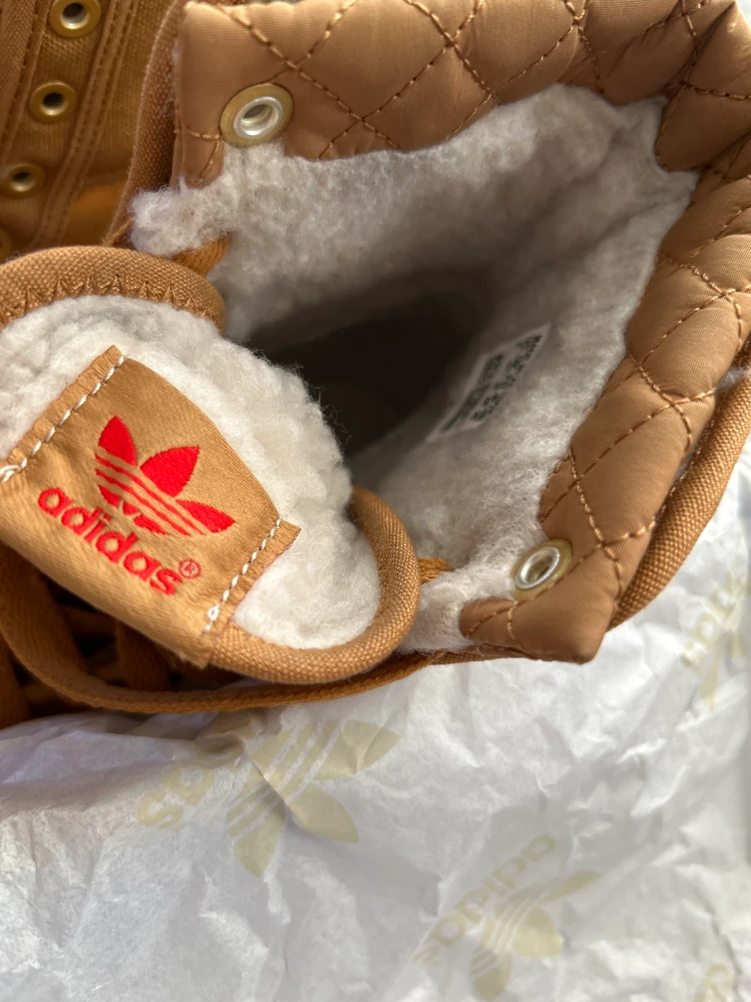 Used - Adidas Honey Hi Collegiate W shoes in a lovely tan colour! They have a unique quilted design and cozy lining. These high-cut shoes are in excellent condition and looks newer but they are obviously used already. Please check out all the photos provided. Smoke/Pet free home. Cash & Pick Up only.