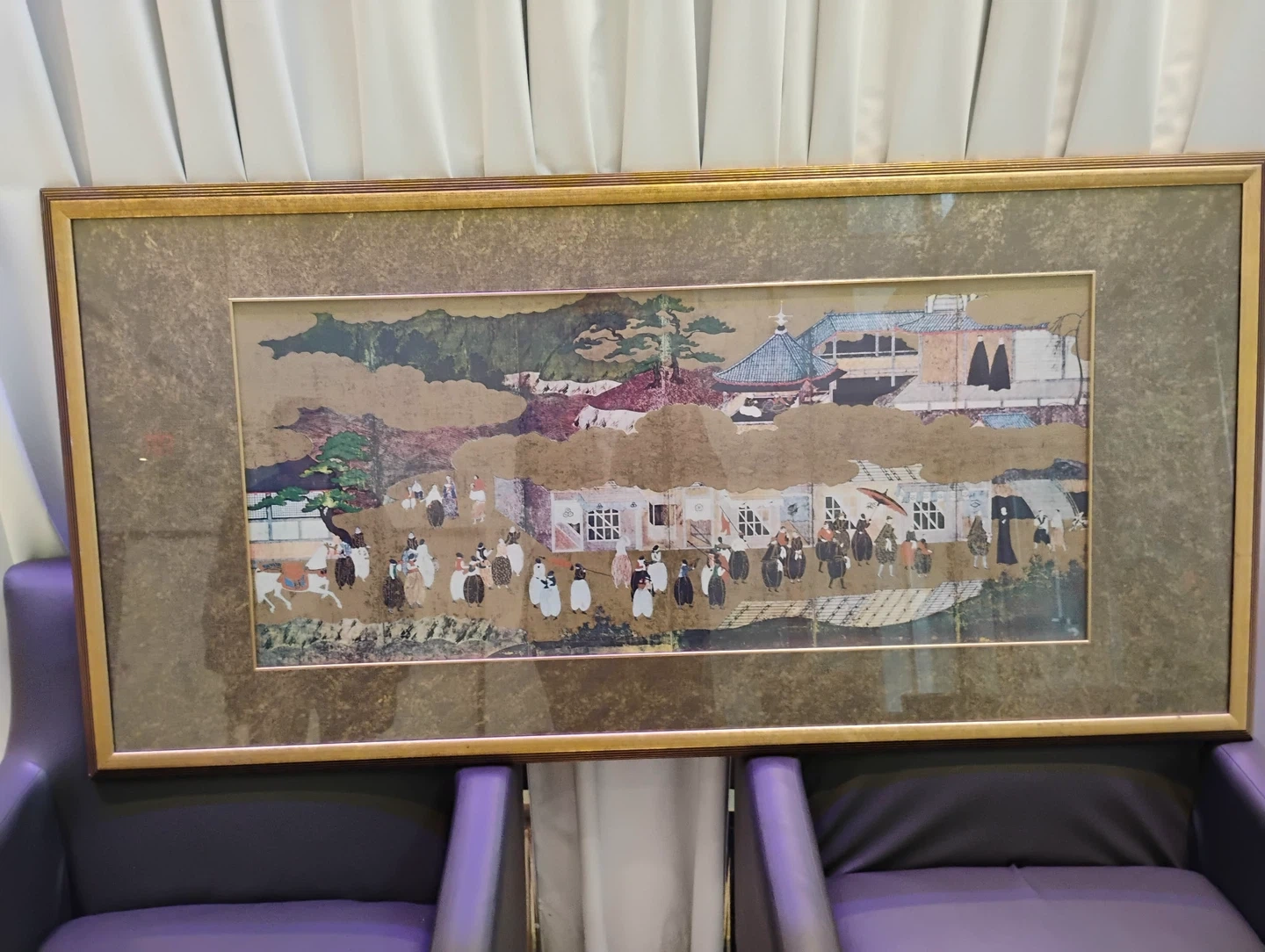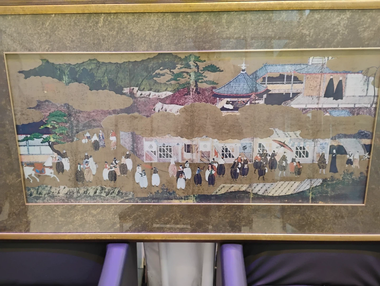 Circa 1950 to 1960s vintage printed copy of antique Japanese screen which was considered to be lost but was found in the archives of art museum in Amsterdam in the mid 20th century. This Japanese fine art depicts the arrival of the Portuguese to Japan in 1543. Saint Francis and another monk are seen at the top right corner. This is a vintage copy of the screen printed by the museum of art. pick up is in a central Toronto location.