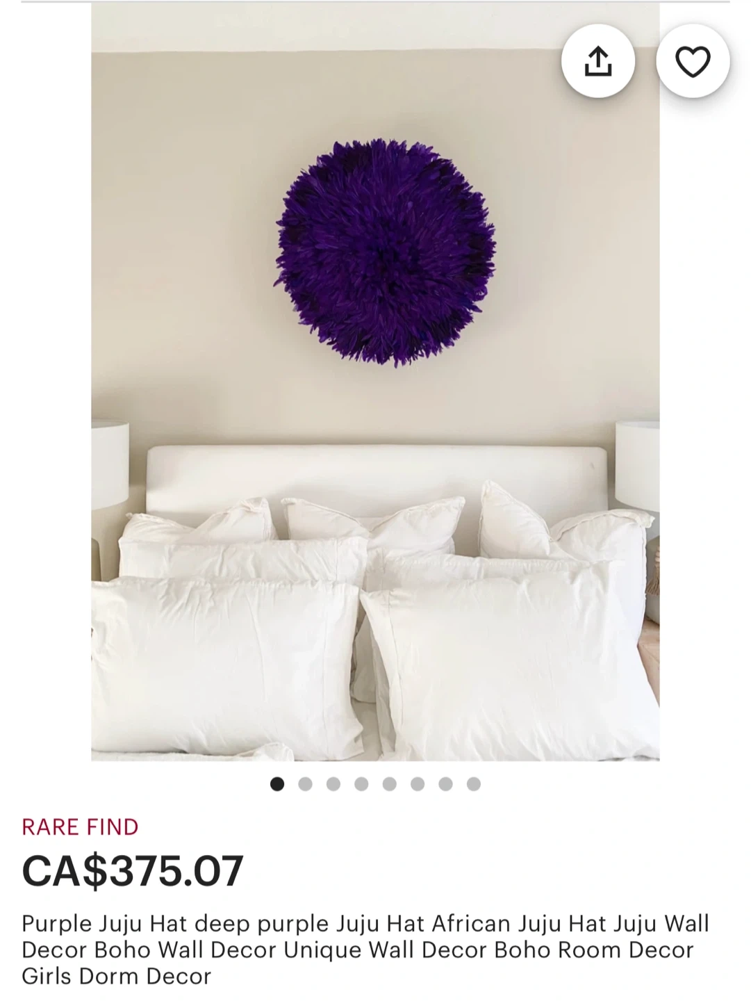 Selling a beautiful purple Juju hat wall decor. It's a unique piece that adds a boho touch to any room. Originally bought for $375.07+ tax + shipping Pick up Dundas and Broadview