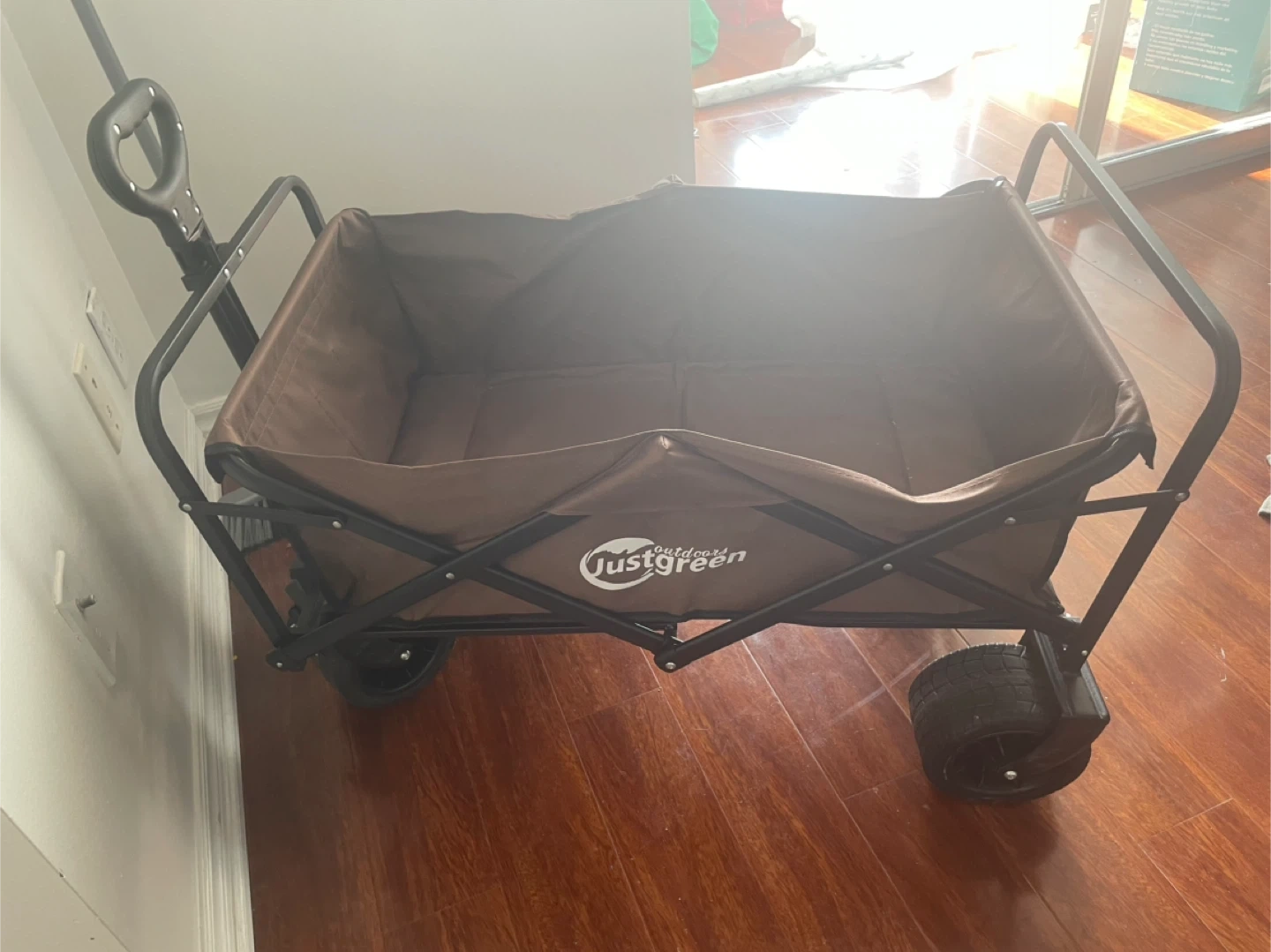 Selling a gently used Justgreen Outdoors folding wagon in brown. It's perfect for hauling groceries, garden supplies, or beach gear! Folds up easily for storage and transport. It is in good condition and ready for its next adventure