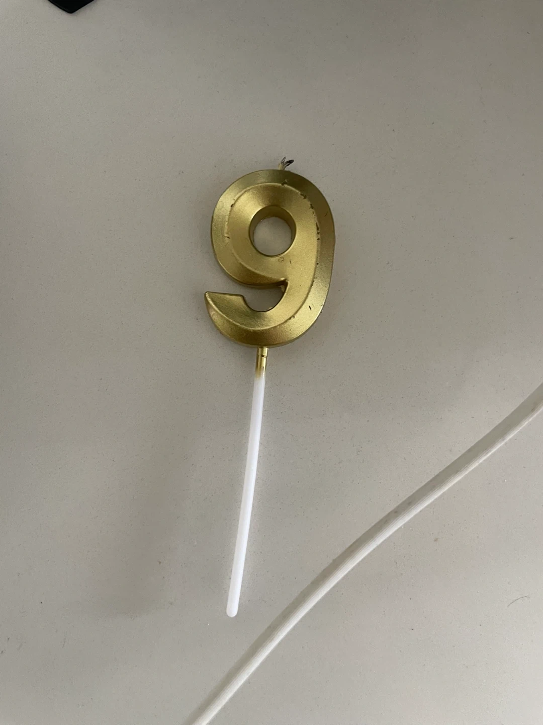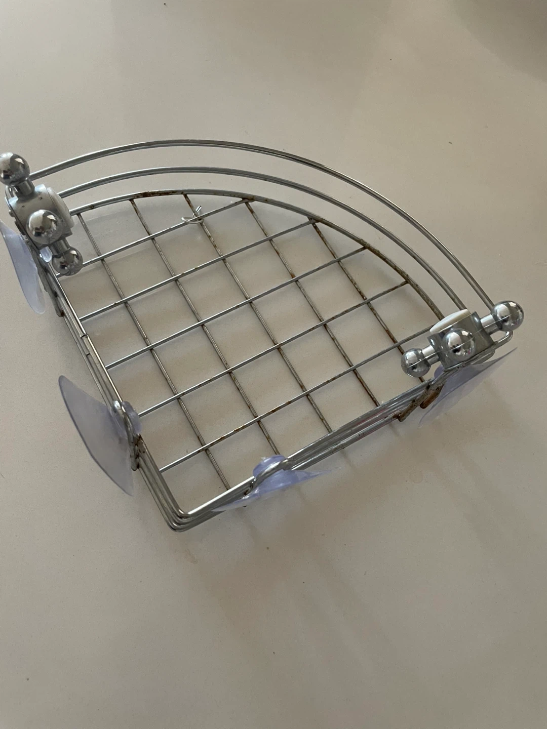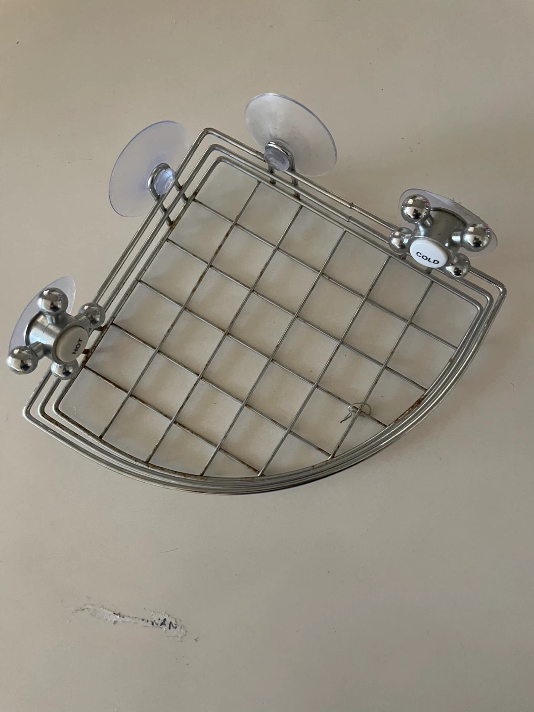 Selling a few miscellaneous items. There's a black metal hairband, a gold number 9 candle, and a chrome corner shelf with suction cups. All items are in used condition.