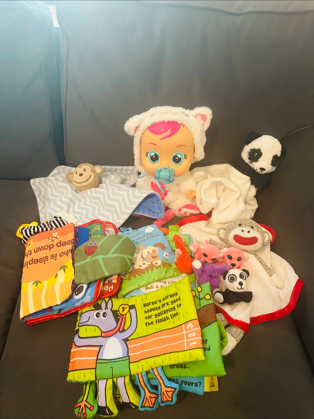 Selling a bundle of baby toys! Includes soft books, a Cry Babies doll, plush toys, and lovevery toy. Just had my daughter bday celebration.All are new and ready for a new home.